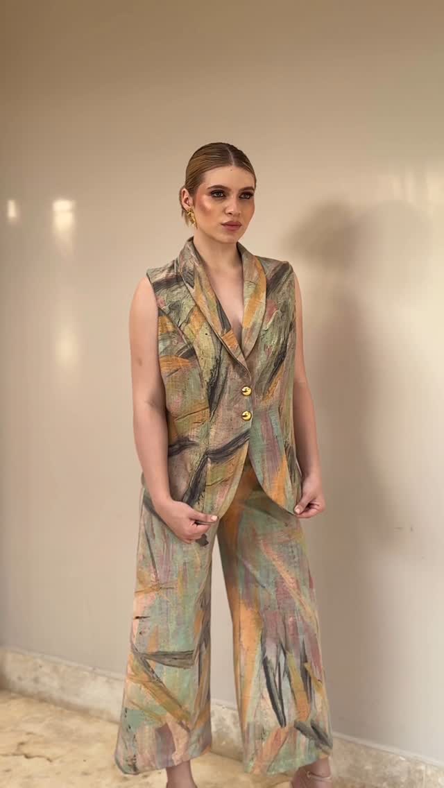 Make a bold fashion statement with this Abstract Print Sleeveless Blazer & Wide - Leg Pants Set. The artistic print and tailored design create a unique, modern look. Perfect for creative events or stylish office days. Lightweight fabric ensures fast page load. Shop now for a standout, chic outfit!