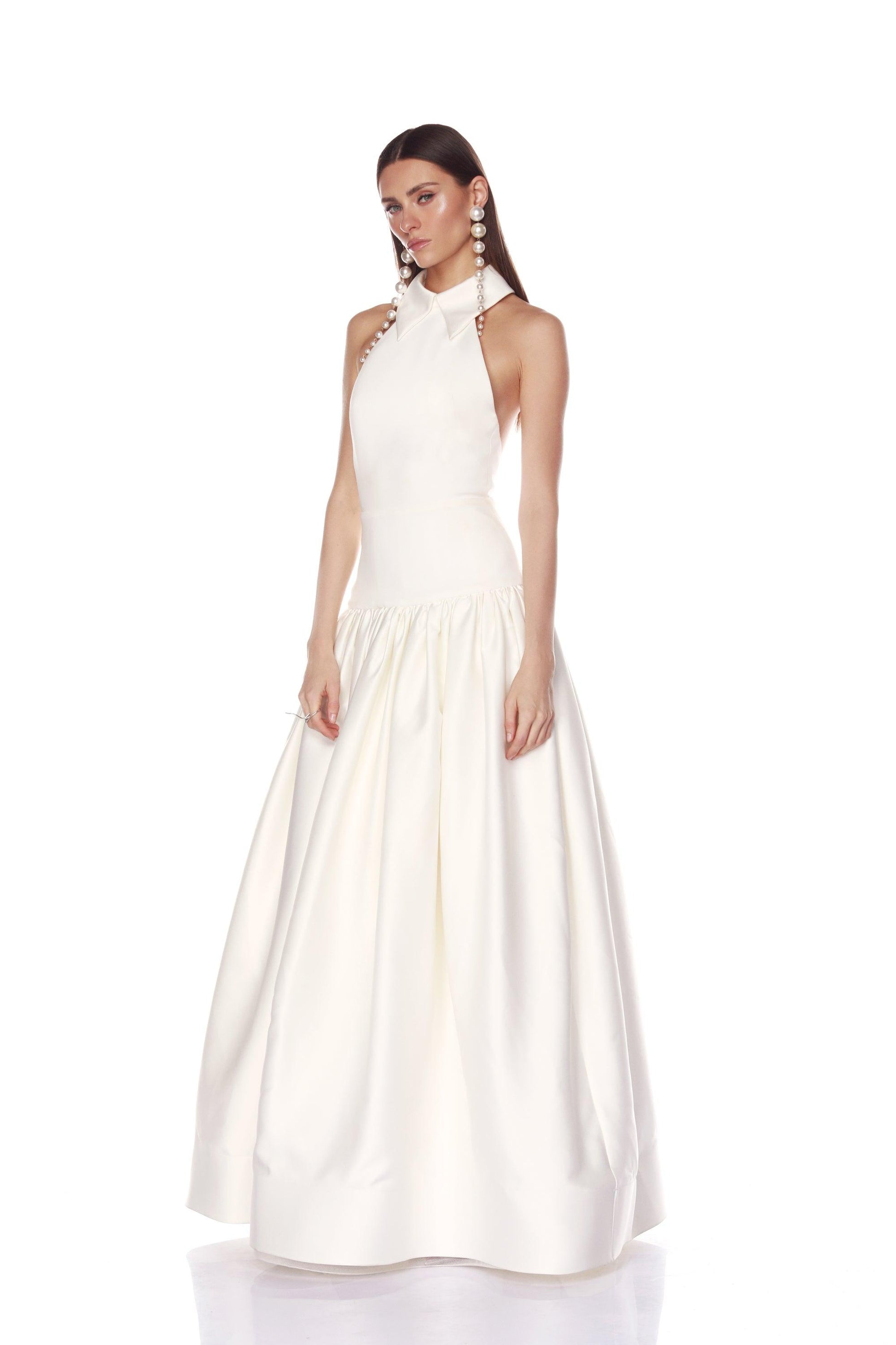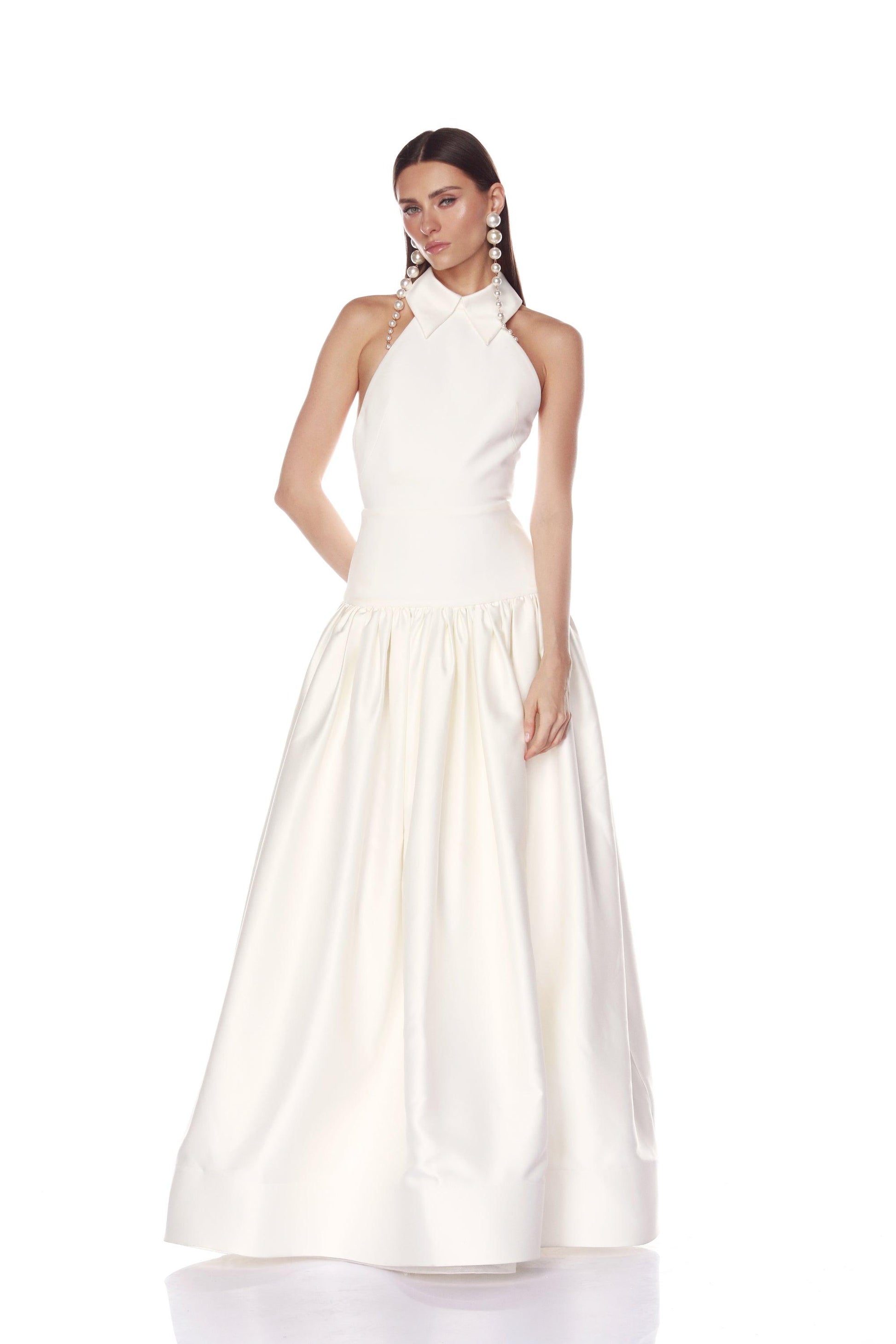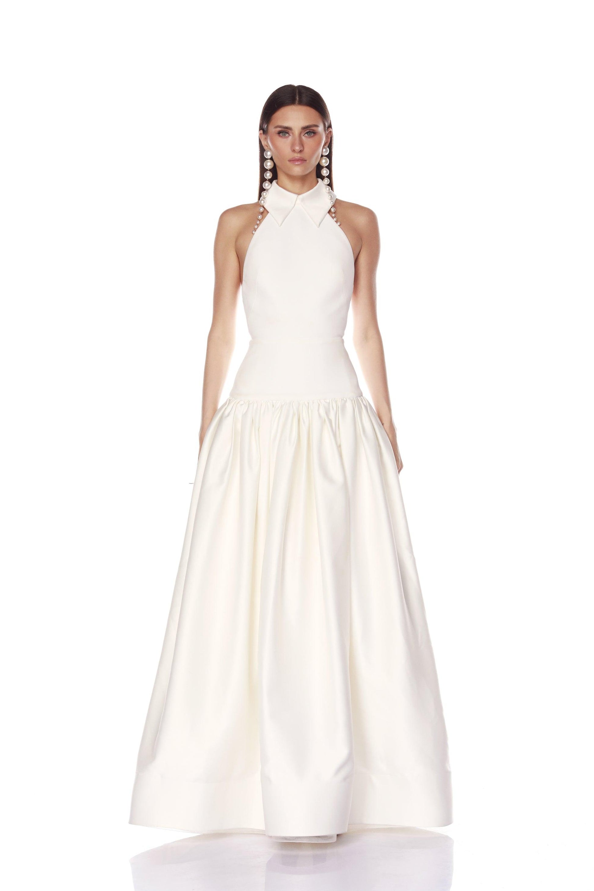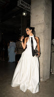 This white maxi dress features a unique halterneck design for an elegant and sophisticated look. Paired with a black tie, it adds a touch of edginess and makes a stunning statement. The high halterneck design accentuates the shoulders and neck, while the voluminous skirt frames the figure with a graceful, alluring elegance. Crafted from premium fabric, this dress drapes beautifully and is comfortable to wear. Perfect for high-end events, fashion shows, or any occasion where you want a striking, glamorous look that blends classic and avant-garde style.