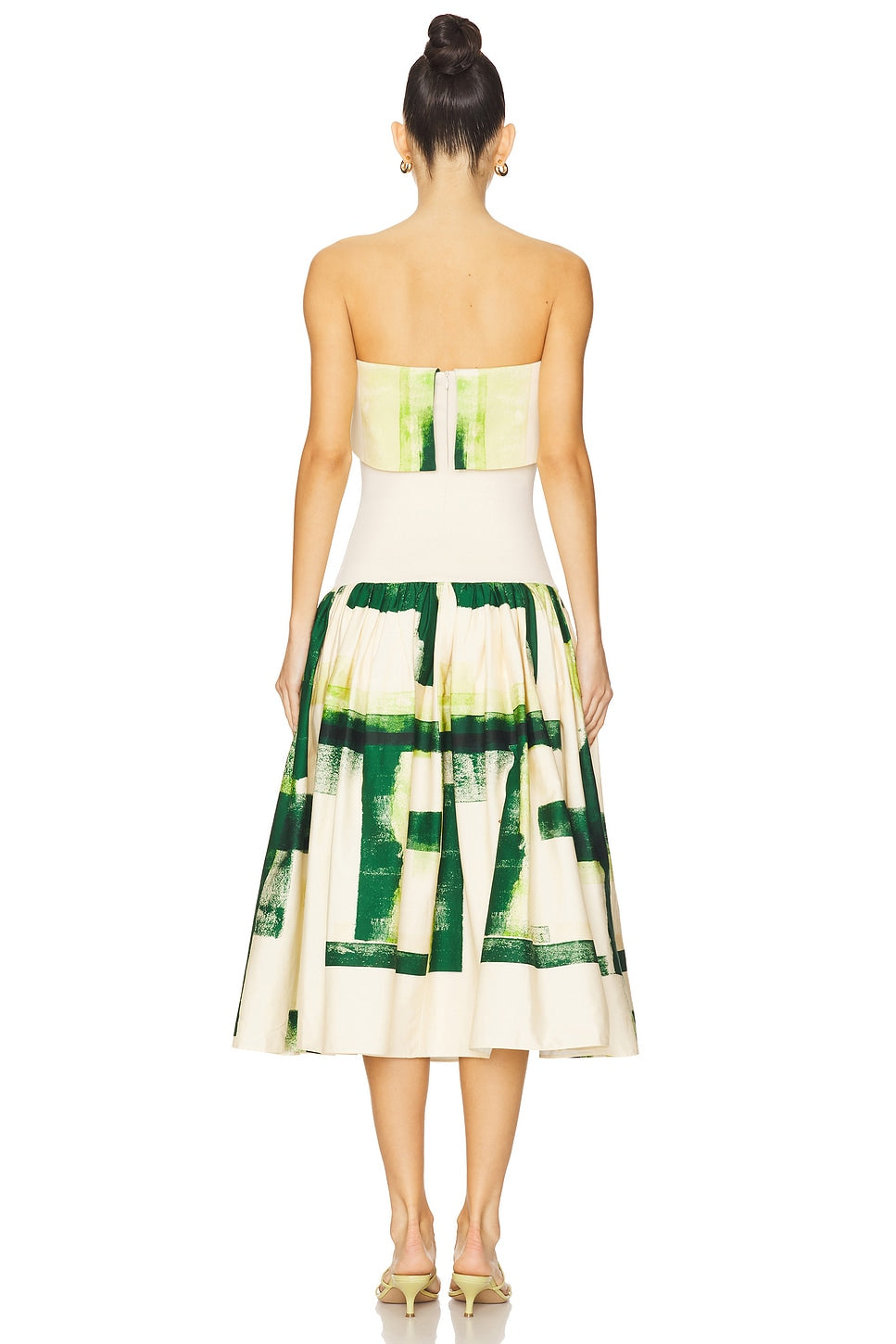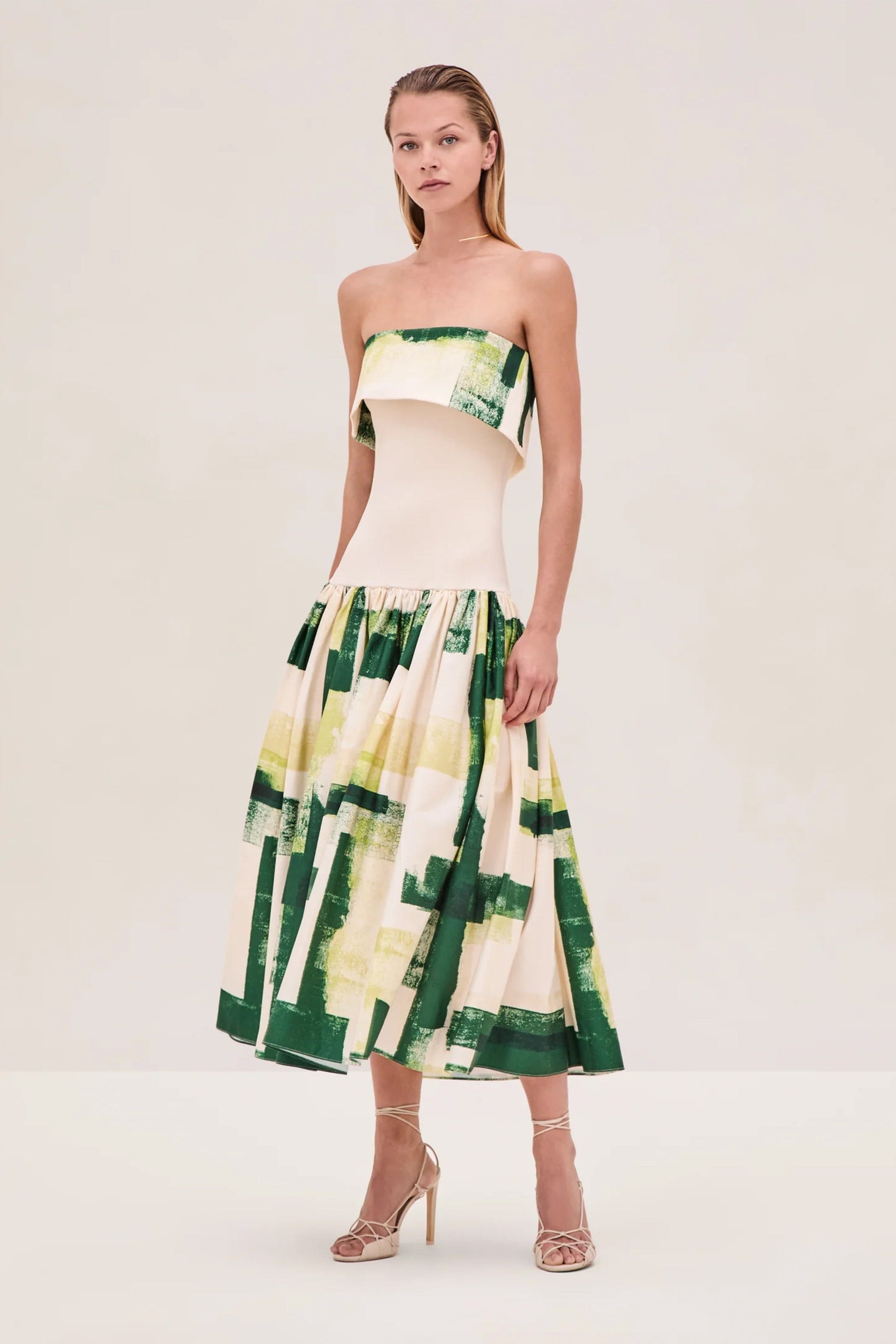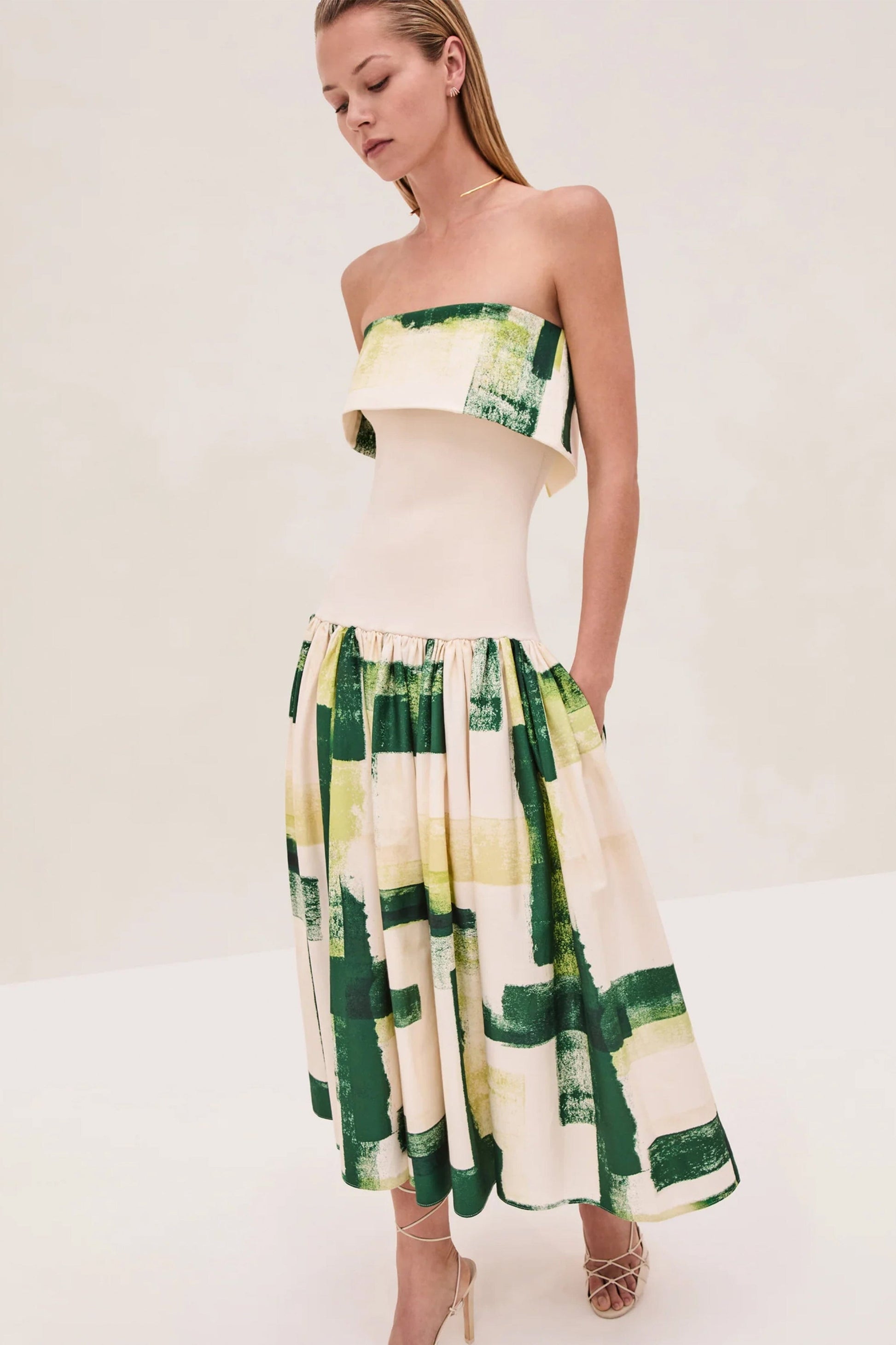 This dress is made of beige and green woven fabric with printed patchwork, features a strapless design, and falls to the knee. Pair it with nude heels and a simple clutch to elevate your overall elegant look.