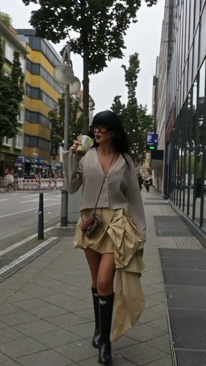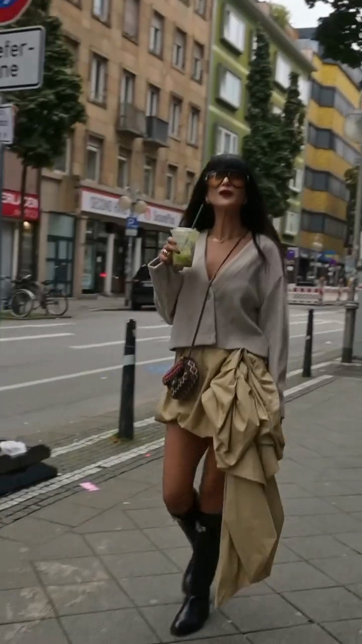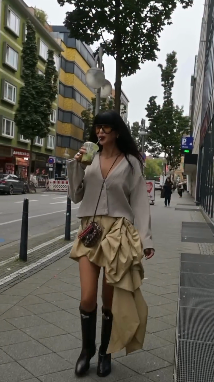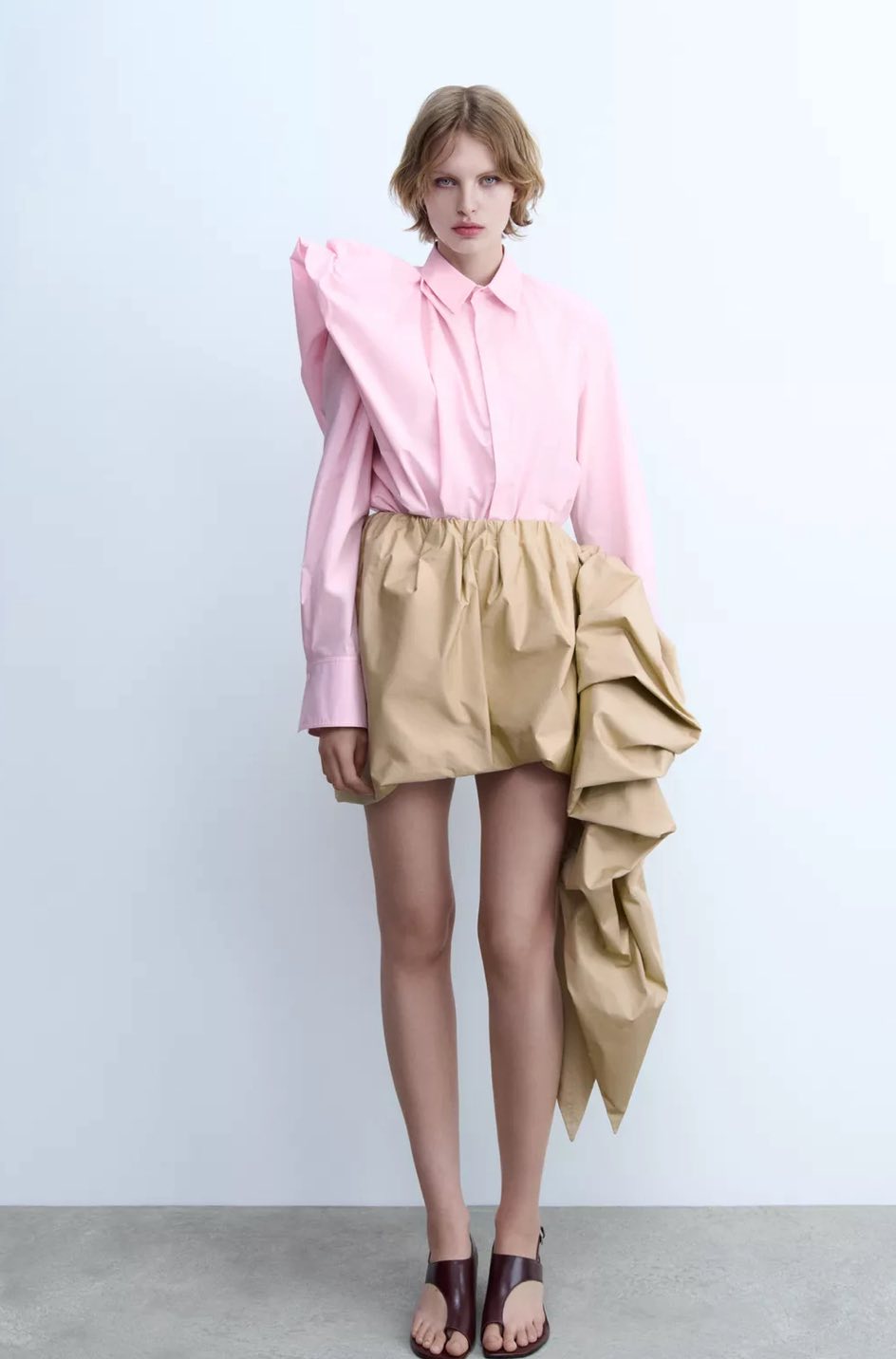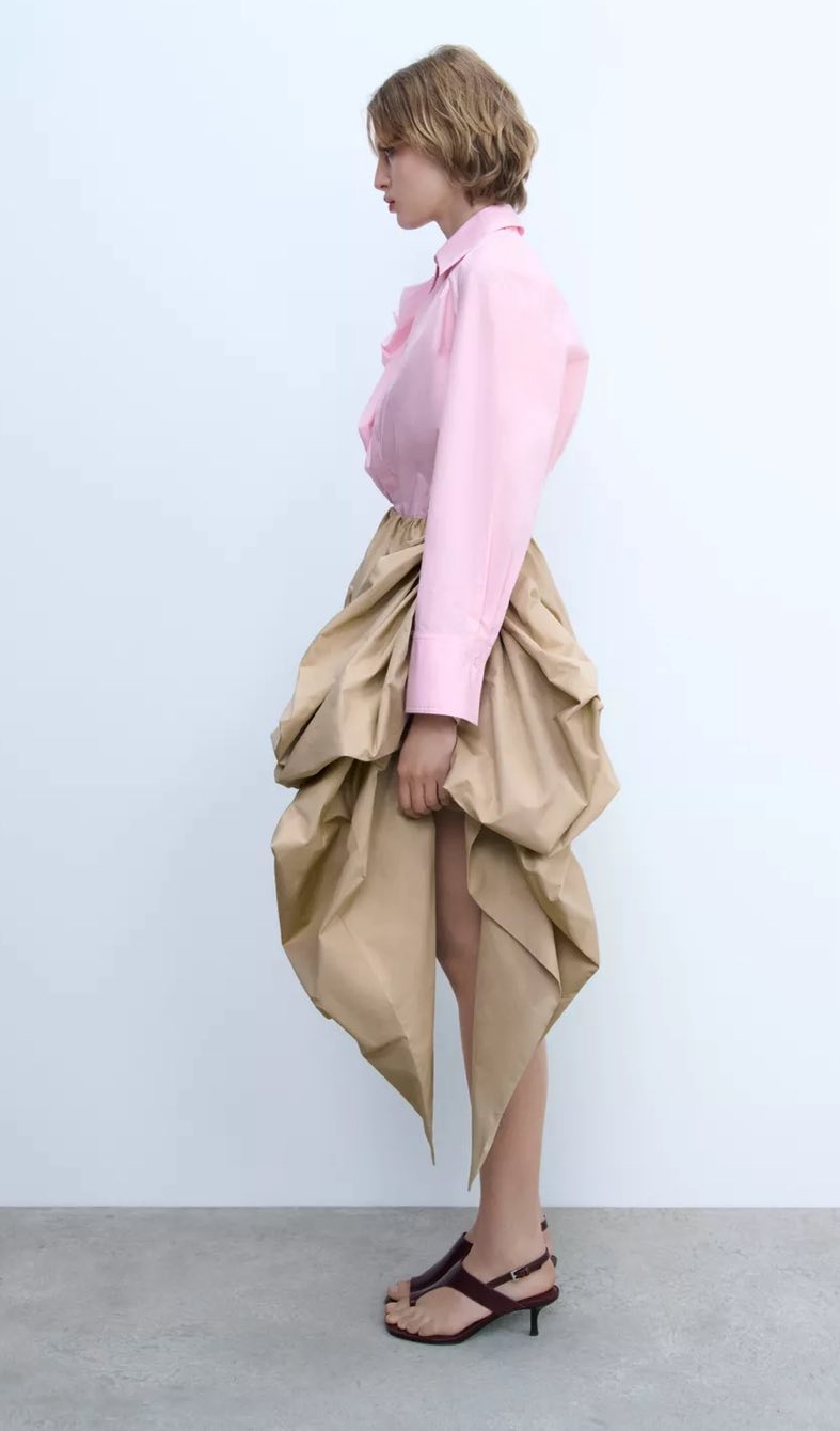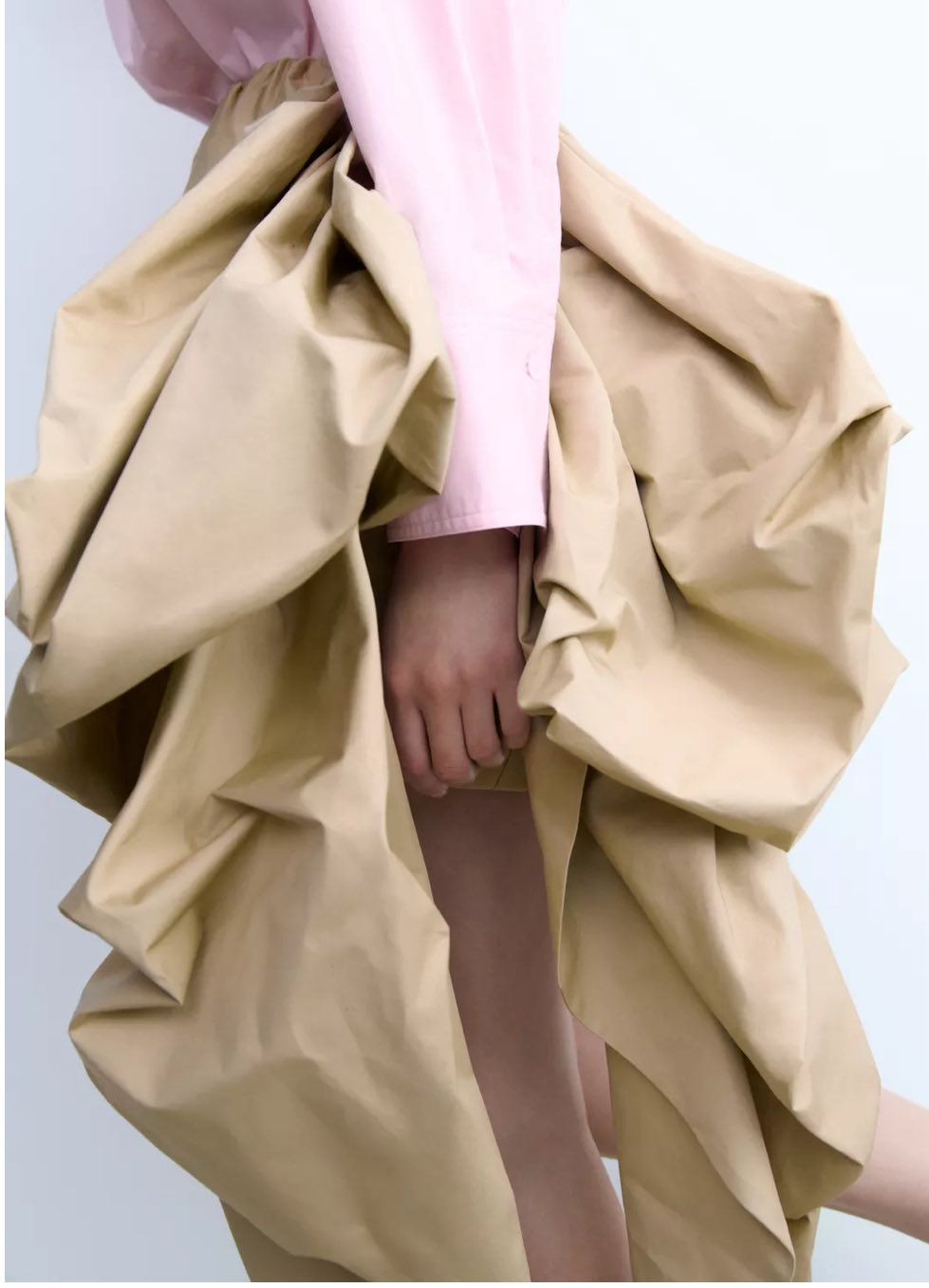 This beige mini skirt features a striking asymmetrical ruffle detail on one side, adding a bold, artistic touch to the classic silhouette. The elastic waistband ensures a comfortable fit, while the structured fabric hugs the skirt perfectly, highlighting the ruffle.