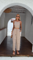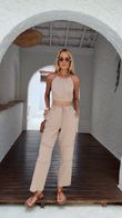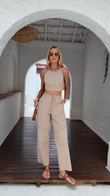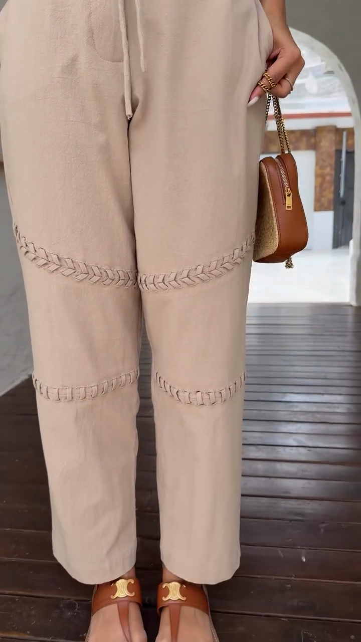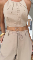 This beige set features a cropped, open-back top with perforated and seamed details, and wide-leg pants with a drawstring waist and decorative seams. Made from a lightweight, breathable cotton and linen blend, it's perfect for casual summer outings like the beach or a café. Style it with sandals and sunglasses.