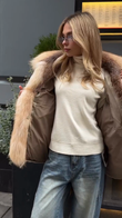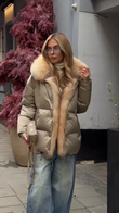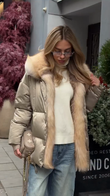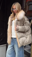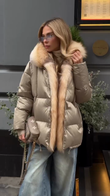 This beige down jacket features fluffy faux fur at the collar and front, adding a touch of luxurious warmth. The loose silhouette provides ample warmth, making it ideal for colder weather.