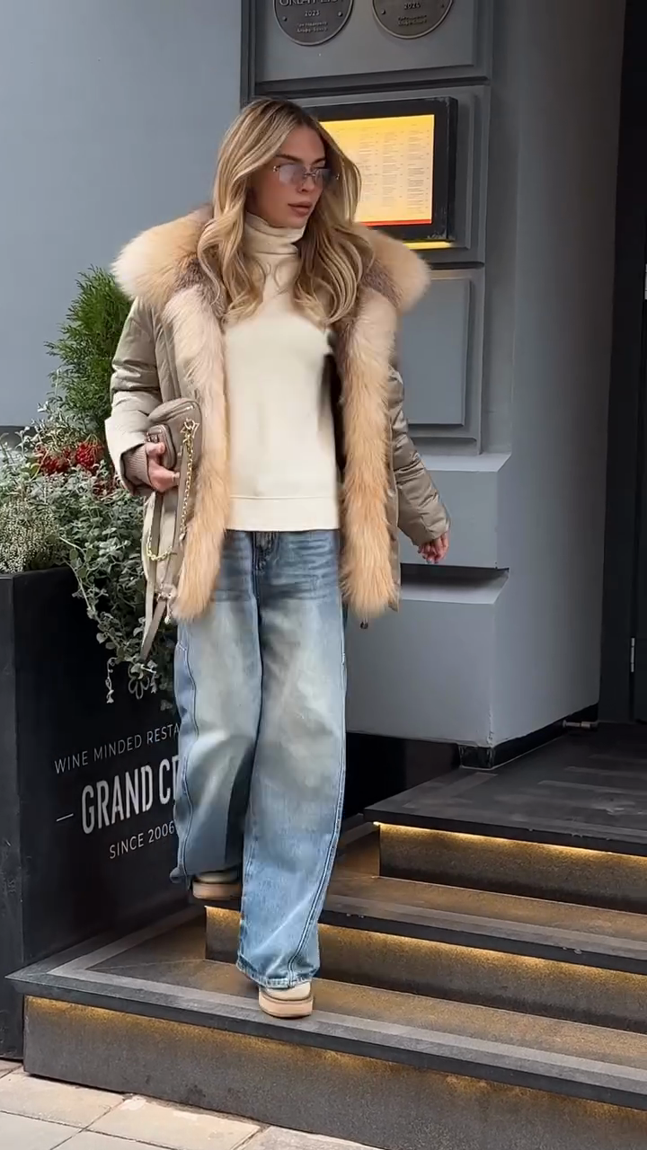 It's perfect for everyday winter outings, such as running errands, casual gatherings, or strolling around the city. Pair it with a beige turtleneck sweater, light-wash wide-leg jeans, and a designer handbag for a stylish and comfortable look. The neutral tones of this down jacket make it easy to pair with a variety of bottoms and accessories.