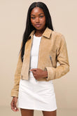 Beige Suede Cropped Jacket with Zipper Details