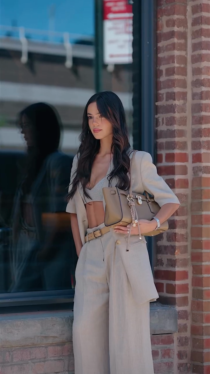 This stylish beige three-piece suit consists of a short-sleeved blazer, a cropped knit top, and wide-leg trousers. The blazer's relaxed cut adds a casual edge to the formal look. The cropped top adds a touch of modern sexiness without sacrificing feminine elegance. This outfit is perfect for urban commuting or semi-formal occasions, creating a look that's both professional and stylish.