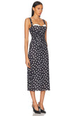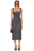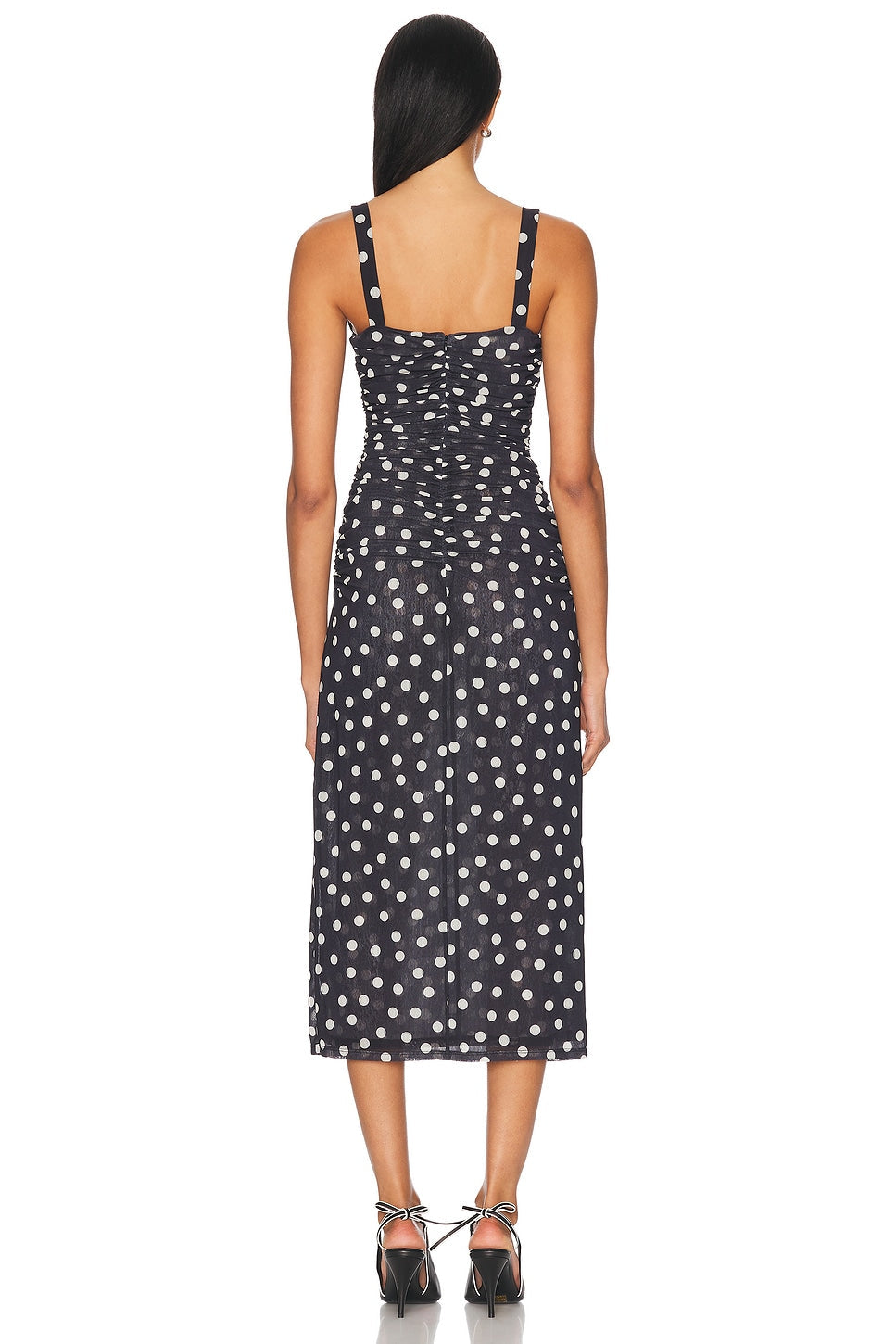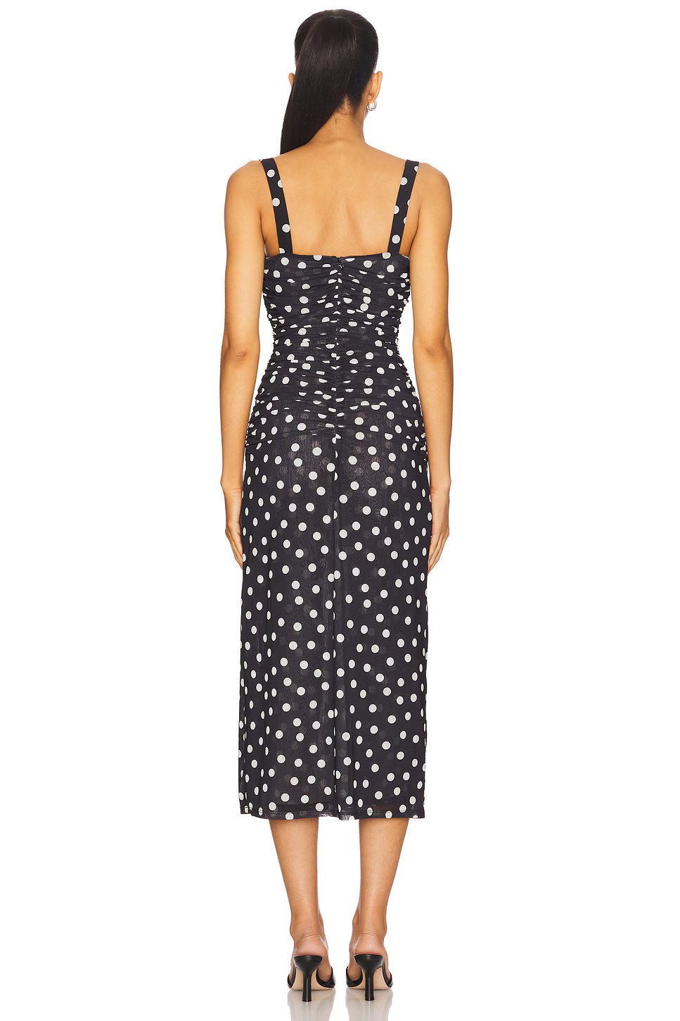 This sleeveless, fitted dress is made of black and white polka-dot mesh fabric, adorned with pleated details and a tulle overlay. Elevate your look by pairing it with black heels and a mini handbag.