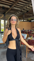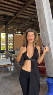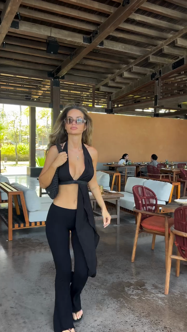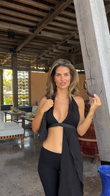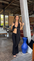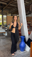 This black, backless cropped top features a plunging V-neck and lace-up design, adding a touch of glamour and sophistication. Paired with high-waisted black flared pants, it creates a sleek, flattering silhouette. The simple black colorway lends it a timeless and versatile look.