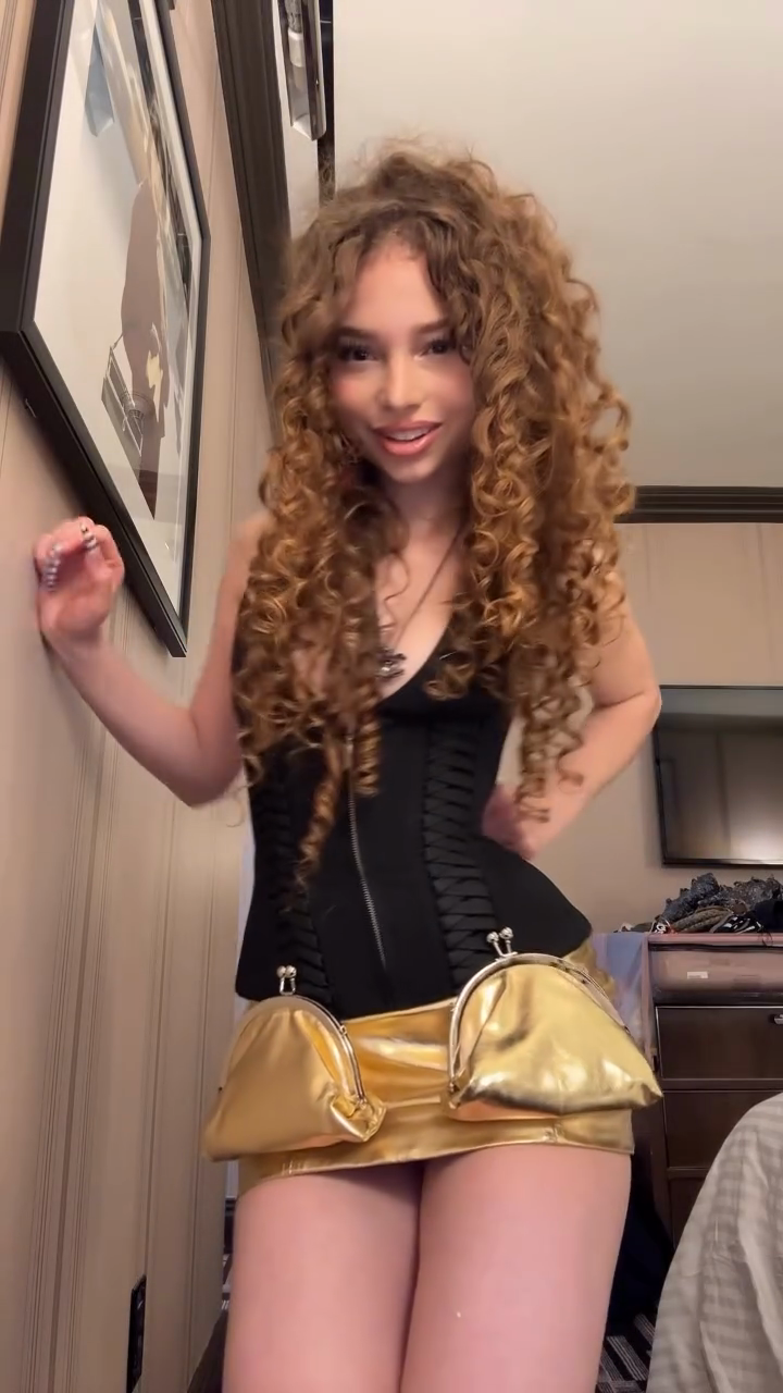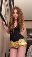 This outfit is truly stunning. The top is a black bustier with a V-neckline and side ties that accentuate the waist for a bold touch. The skirt is a metallic gold miniskirt, shimmering and captivating. Two gold pouches at the hem add a unique touch, creating a look that's both practical and stylish. The structured black bustier paired with the shimmering gold skirt creates an edgy and captivating look perfect for a night out or a fashion-forward occasion.