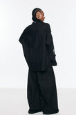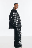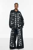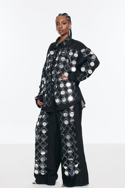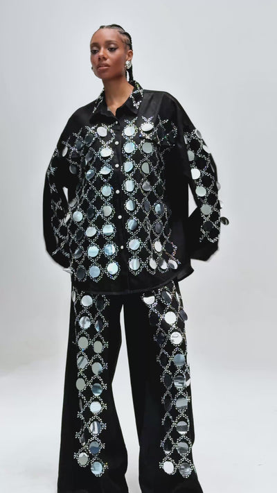 This outfit consists of a black denim button - up shirt and matching wide - leg denim pants. Both pieces are adorned with numerous circular mirror embellishments arranged in a diamond - like pattern, creating a striking, eye - catching effect. The shirt has a classic collar and long sleeves, while the pants have a loose, comfortable fit. This ensemble is suitable for a fashion - forward casual look or events where making a bold style statement is desired.