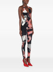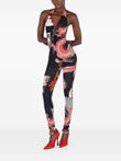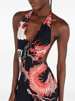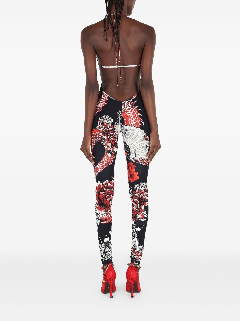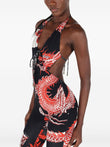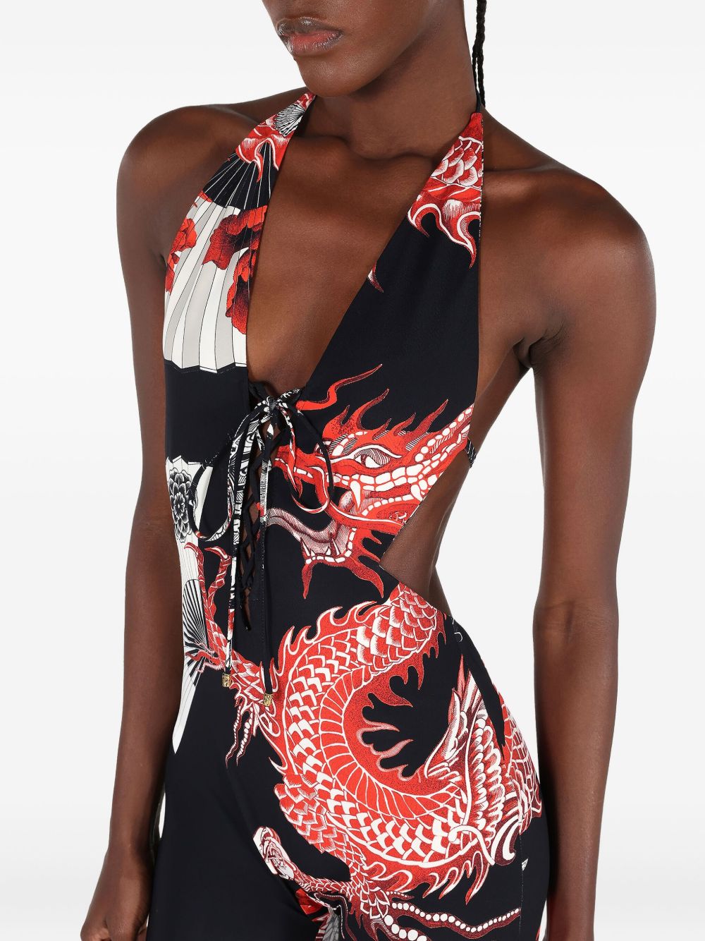 This jumpsuit features an open back, a plunging V-neckline, and side cutouts for added appeal. The black fabric is embellished with vibrant prints, including red dragons, white fans, and floral motifs, drawing inspiration from Eastern aesthetics.
