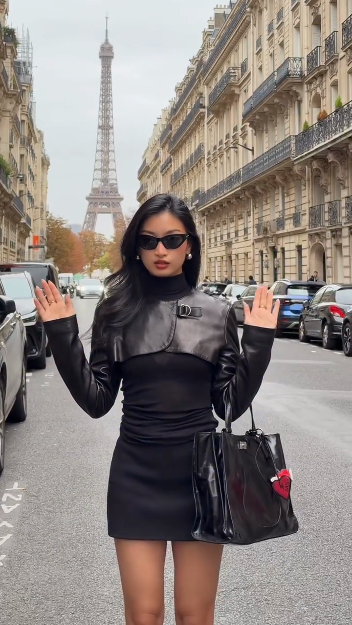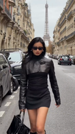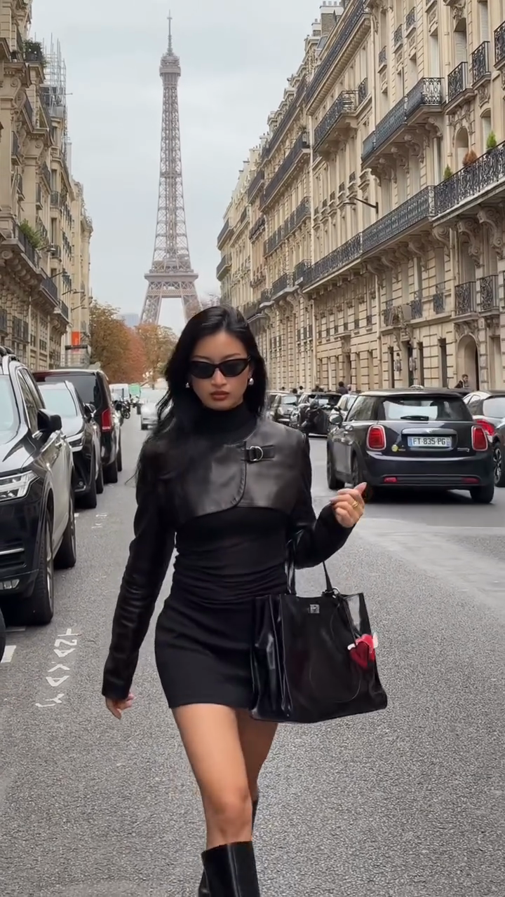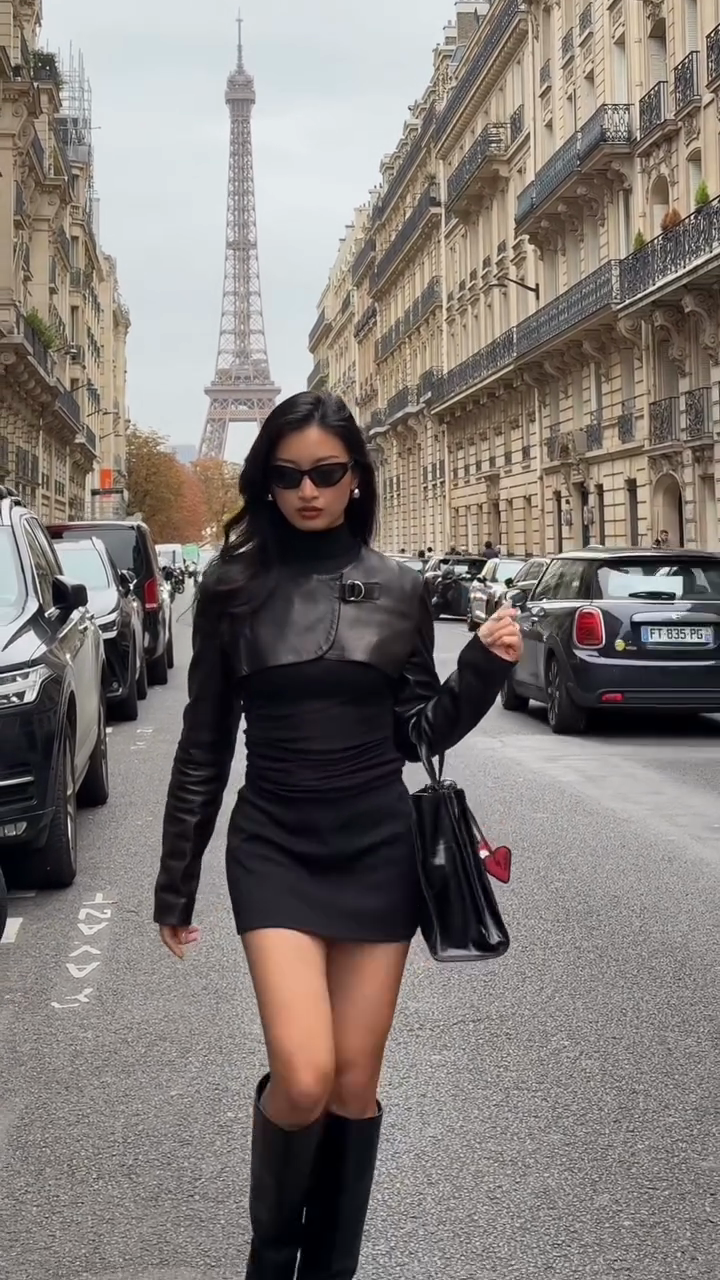 This outfit features a black leather jacket and a matching dress. The jacket's sharp silhouette and unique buckle design add a touch of style. The dress's fitted cut and ruched details flatter the figure, creating a stylish and harmonious look.
