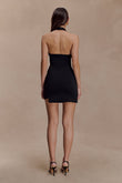 This black mini dress features an off-the-shoulder design that accentuates the shoulders and upper back. The plunging V-neckline and clever mesh cutouts at the sides and hem add a touch of glamour and edge. The slim-fitting silhouette flatters the figure, making it an ideal choice for women who seek to make a statement.