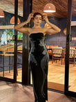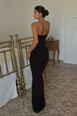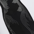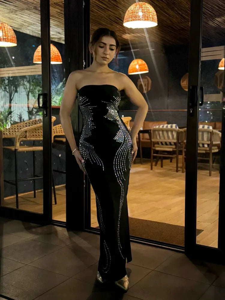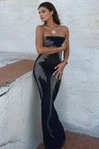 Crafted from black mesh with crystal detailing, this off-the-shoulder dress features a crystal pattern, a mermaid silhouette, and a maxi skirt. Paired with metallic heels and statement jewelry, this black off-the-shoulder maxi dress will add a touch of glamour to your evening look.