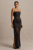 This black satin lace dress features pleats and lace trim, a strapless design, and a knee-length hem. Pair it with black high heels and gold earrings to elevate the overall look.