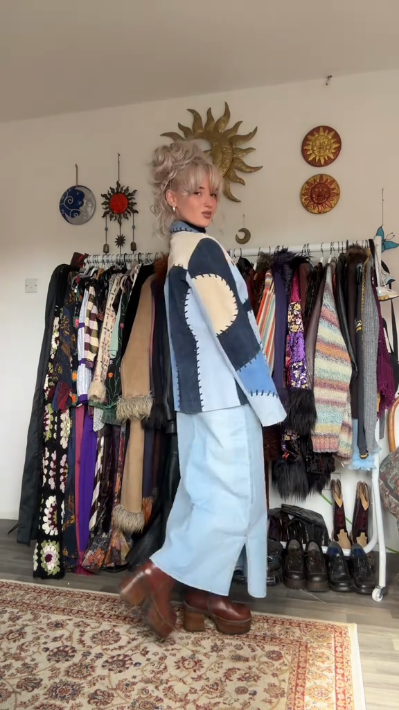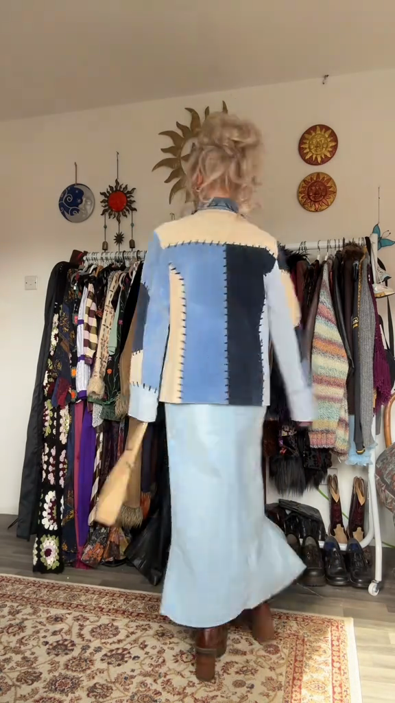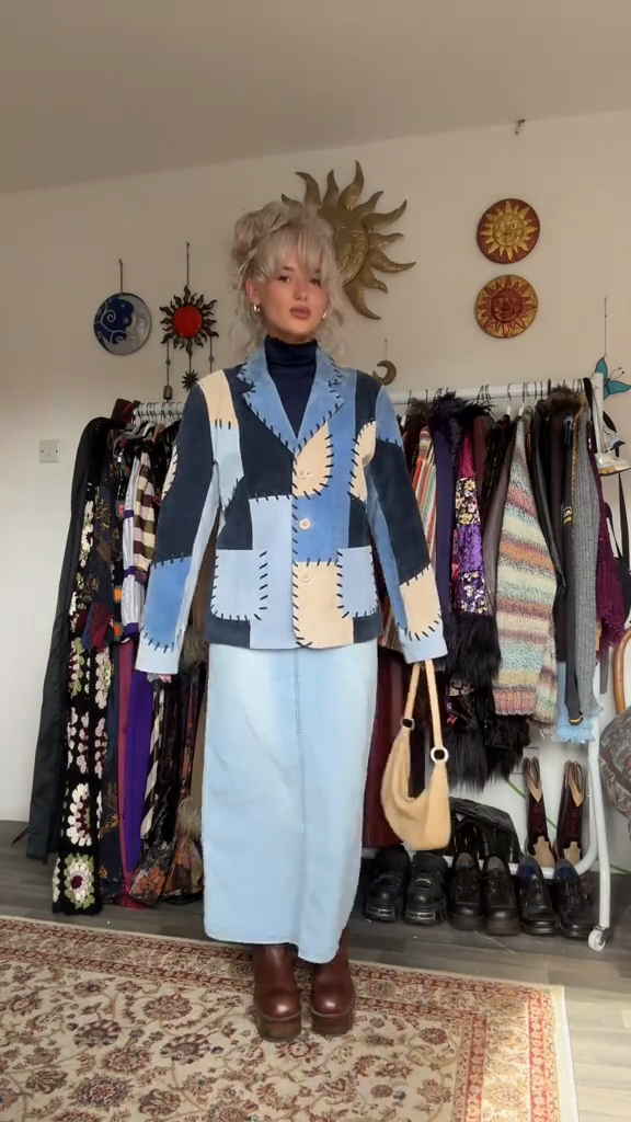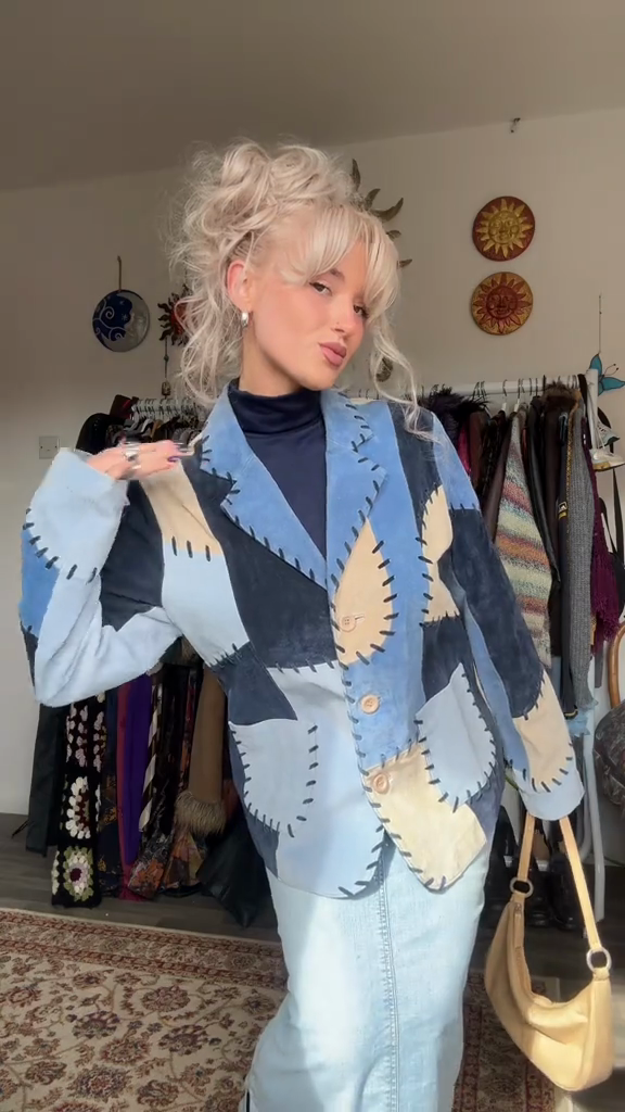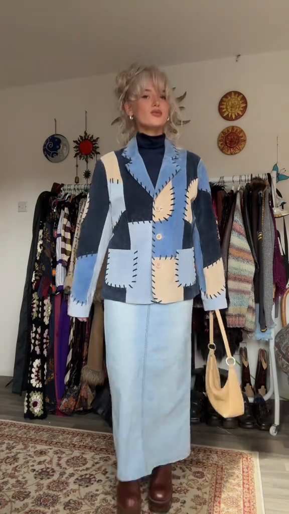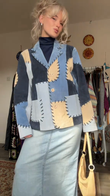 This blazer is made of blue-beige corduroy with a patchwork pattern, featuring a single-breasted design and a relaxed fit. Pair it with a denim skirt and a neutral-colored top for an effortlessly stylish look.
