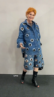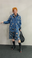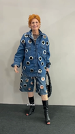 This blue denim grommet-embellished ensemble features an oversized shirt and knee-length shorts. Elevate your edgy casual look with black peep-toe boots and a textured bag.