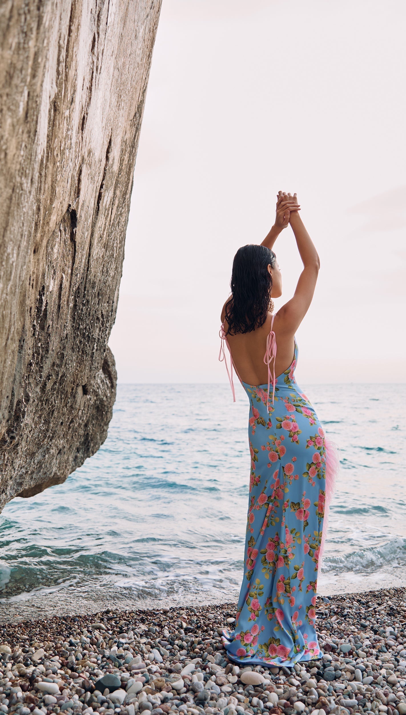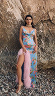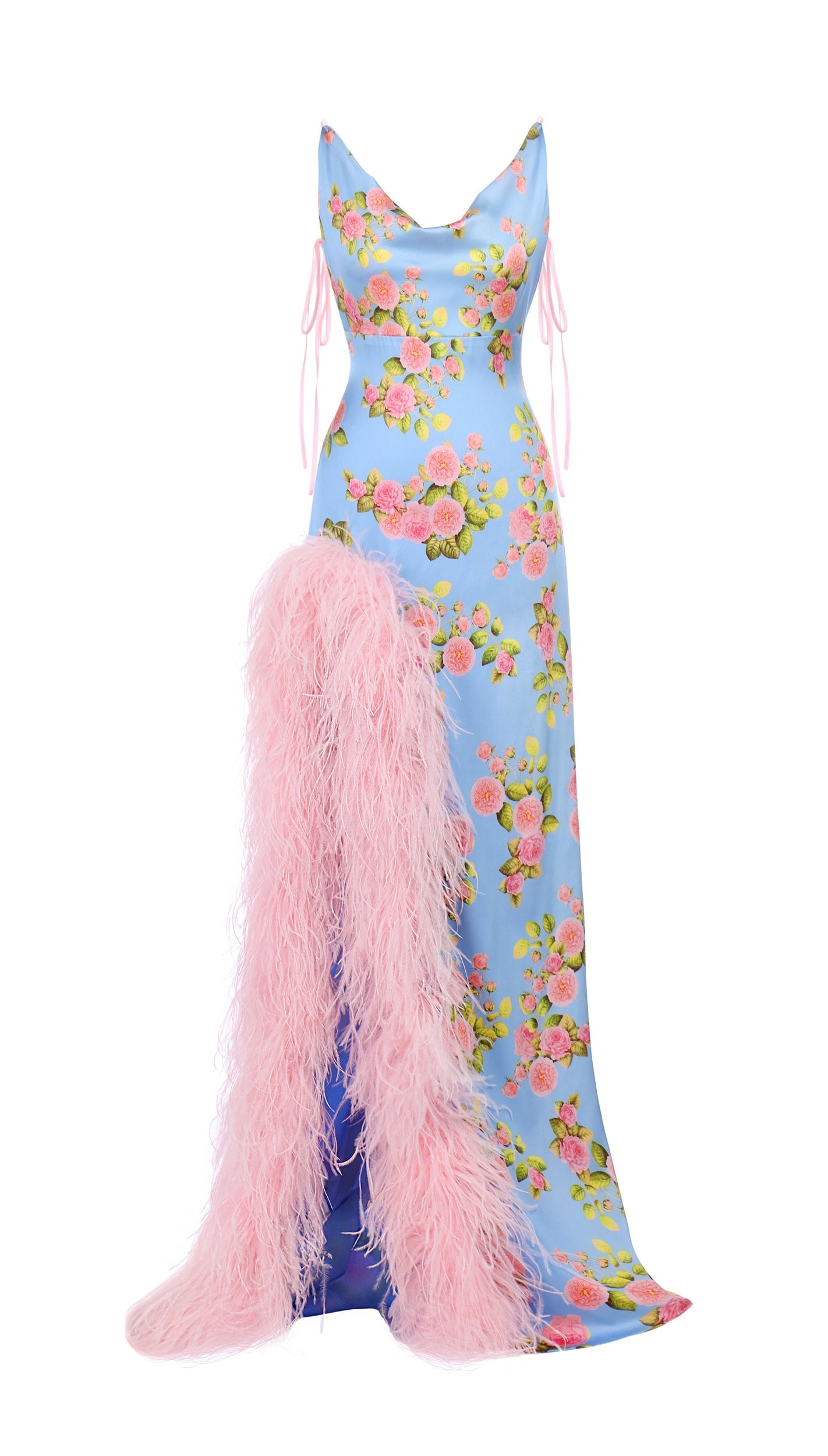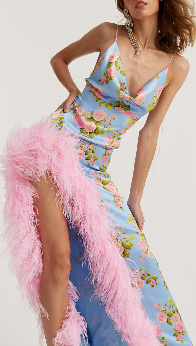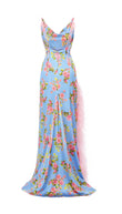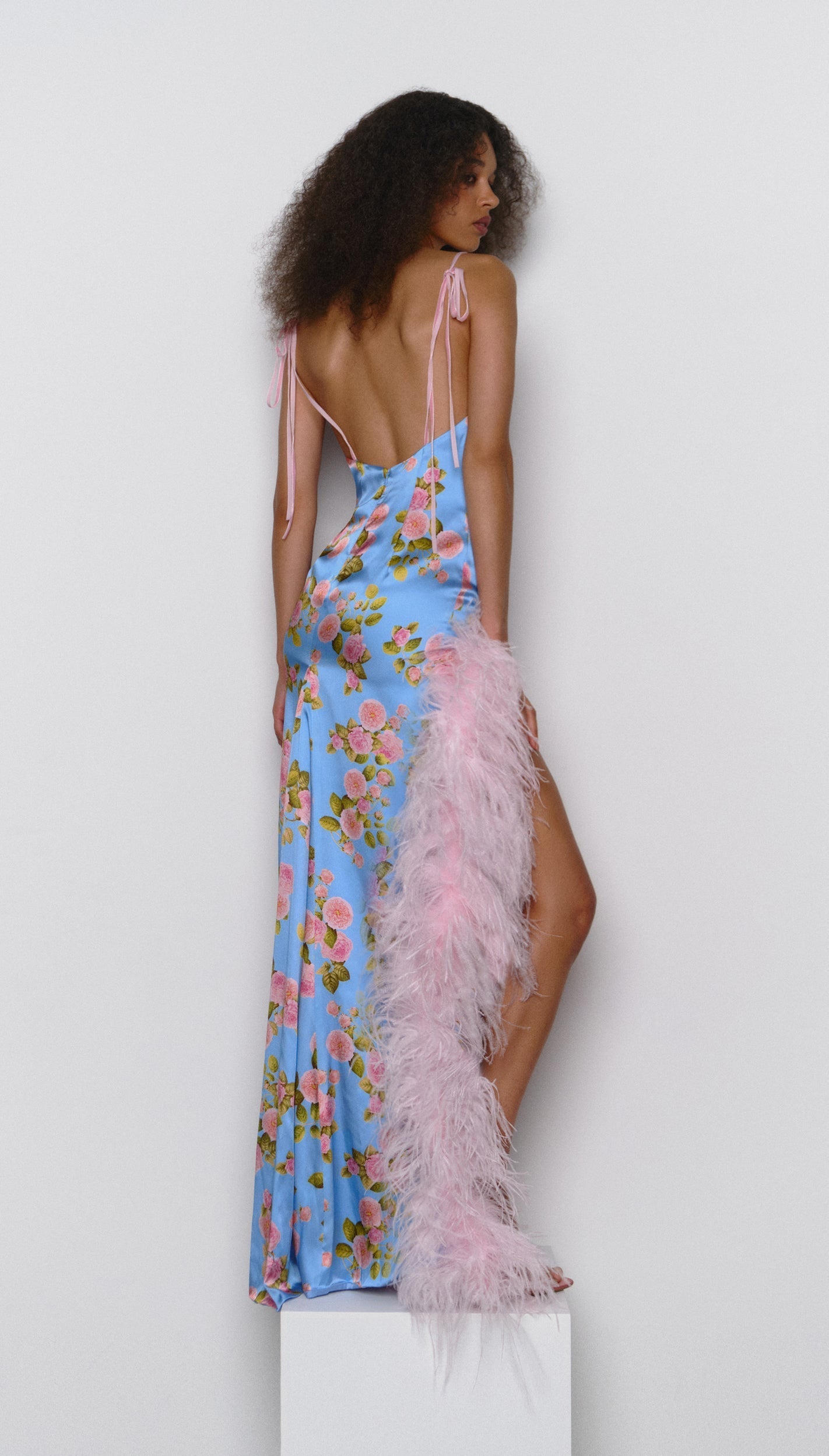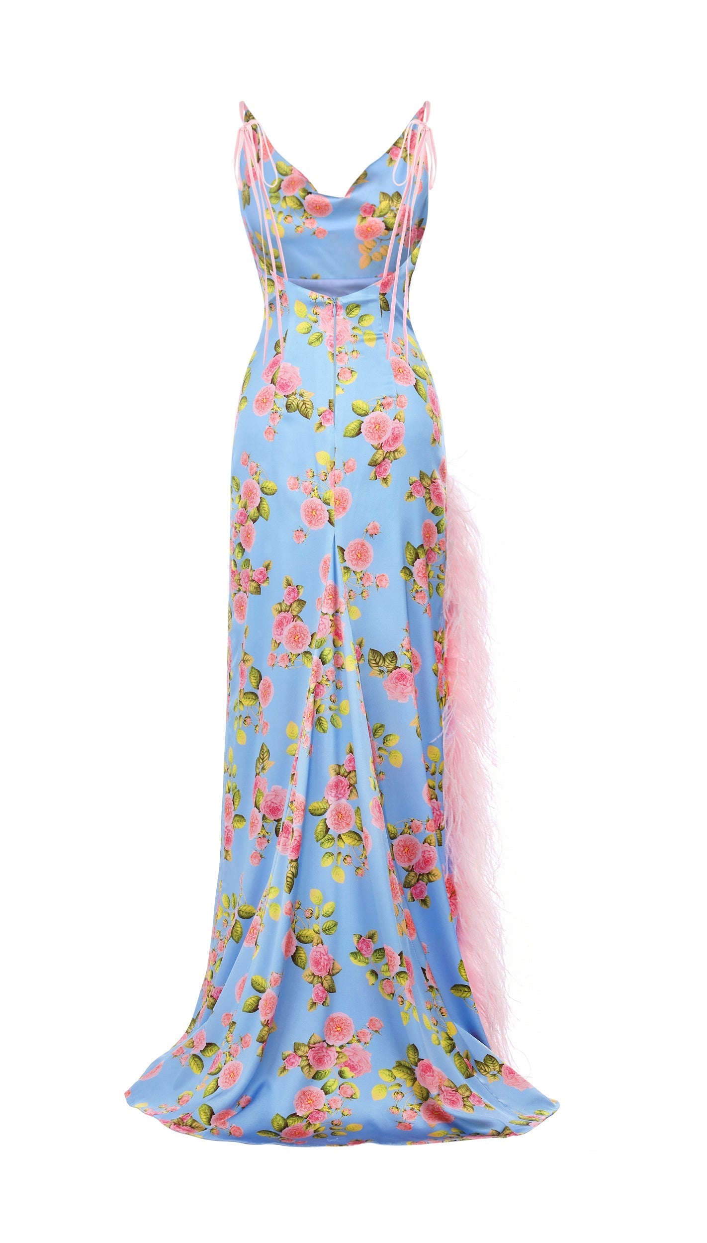 Blue Floral Print Satin Maxi Dress with Feather Trim