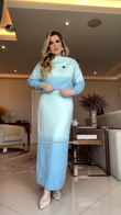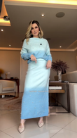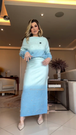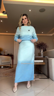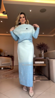 This blue gradient knit set features an off-the-shoulder design adorned with pearls, paired with a matching midi skirt for a seamless color transition. Try accessorizing with nude heels and pearl jewelry for an elegant yet casual look.