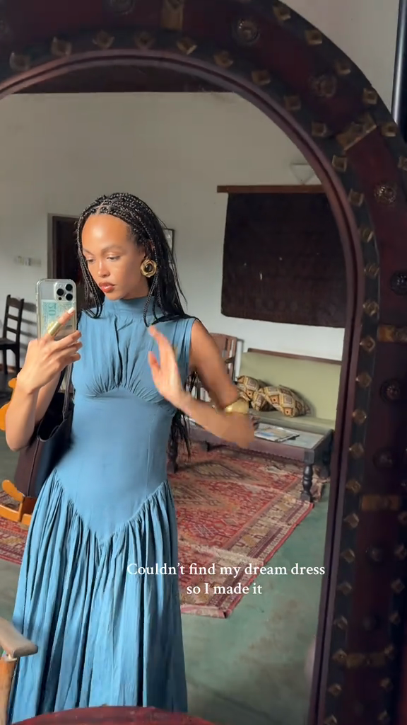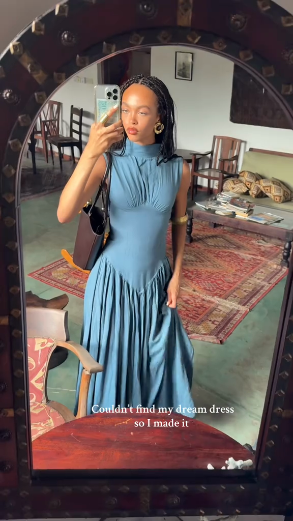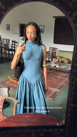 Craft your dream look with this Blue Mock Neck Ruched Midi Dress. The high mock neck, ruched bust, and flowing midi skirt create an elegant, custom - like silhouette. Perfect for special events or standout everyday style.