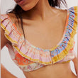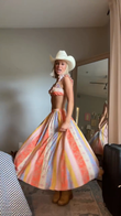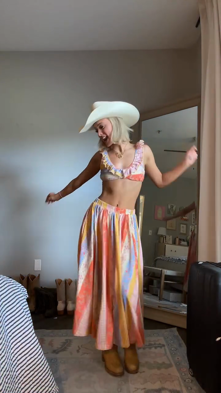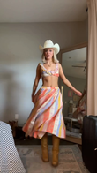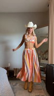 This outfit embodies bohemian chic. A softly ruffled cropped top paired with a flowing maxi skirt is embellished with stripes in vibrant, warm hues like orange, yellow, and pink.