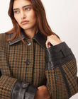 This brown houndstooth wool-blend jacket is crafted from leather-trimmed fabric and features a lapel silhouette with leather trim at the collar, cuffs, and hem. Pair it with jeans and ankle boots for a casual, retro look with a modern twist.