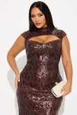 This captivating brown sequined gown features a high neckline, short sleeves, and a unique bust cutout. Its slim fit perfectly accentuates the wearer's curves. The dense sequins shimmer under the light, creating a gorgeous, eye-catching effect. Paired with simple strappy high-heeled sandals and a silver clutch, this look is perfect for formal occasions like gala dinners, award ceremonies, and high-end parties. The sequins create a metallic effect, while the base fabric is a slightly stretchy silk or similar fabric for a comfortable, close-fitting fit.