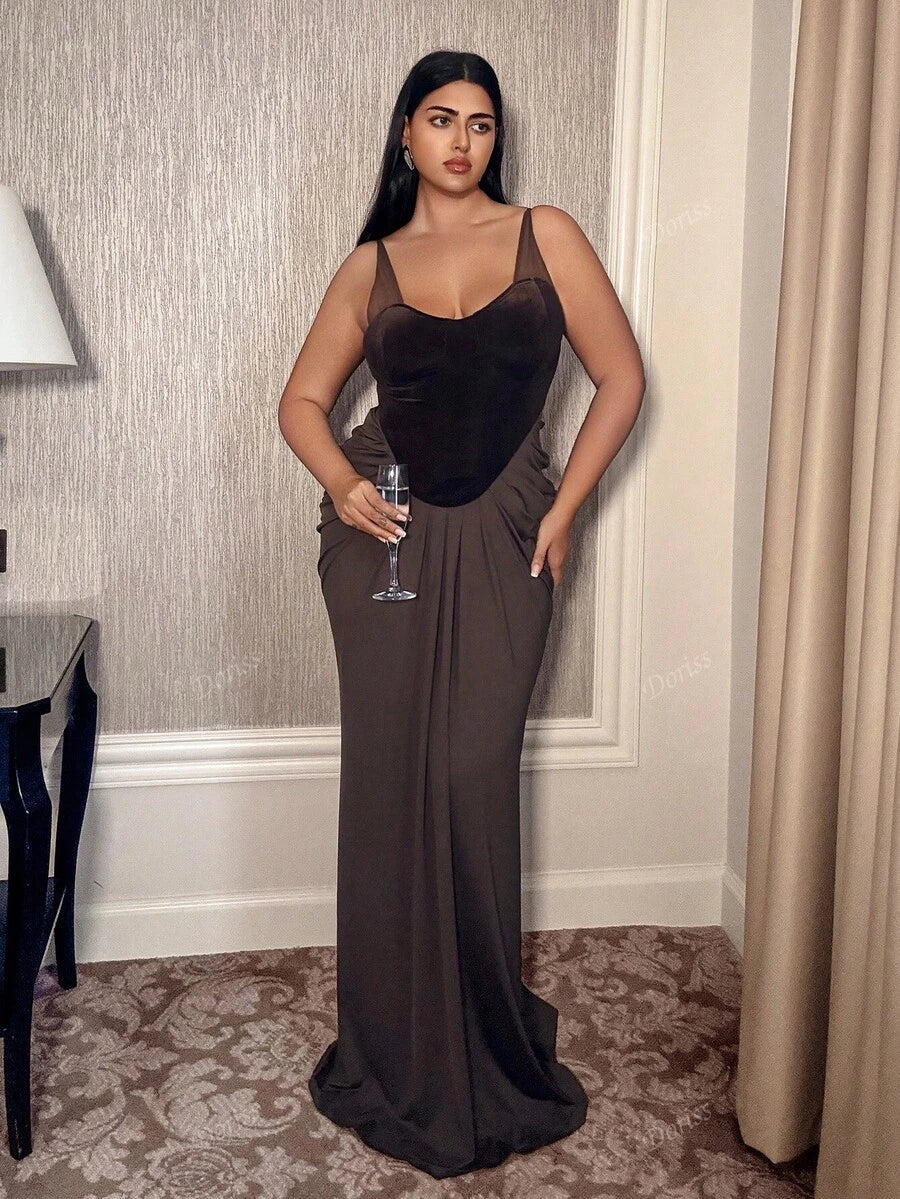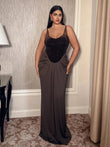 This evening gown features a sleeveless silhouette with a sweetheart neckline and a contrasting dark bodice that flatters the figure. The flowing mermaid skirt exudes elegance and sophistication. The soft, draped fabric adds a luxurious touch.