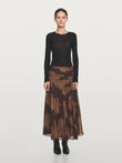 This outfit consists of a brown suede jacket and a brown chiffon midi skirt. The skirt is adorned with metallic threads, features a wrap-style waist, reaches the knees, and is decorated with paisley patterns. The jacket has tassel embellishments. Paired with black boots, it creates an effortlessly stylish look.
