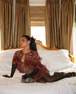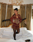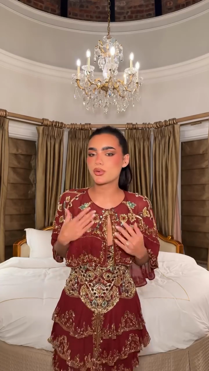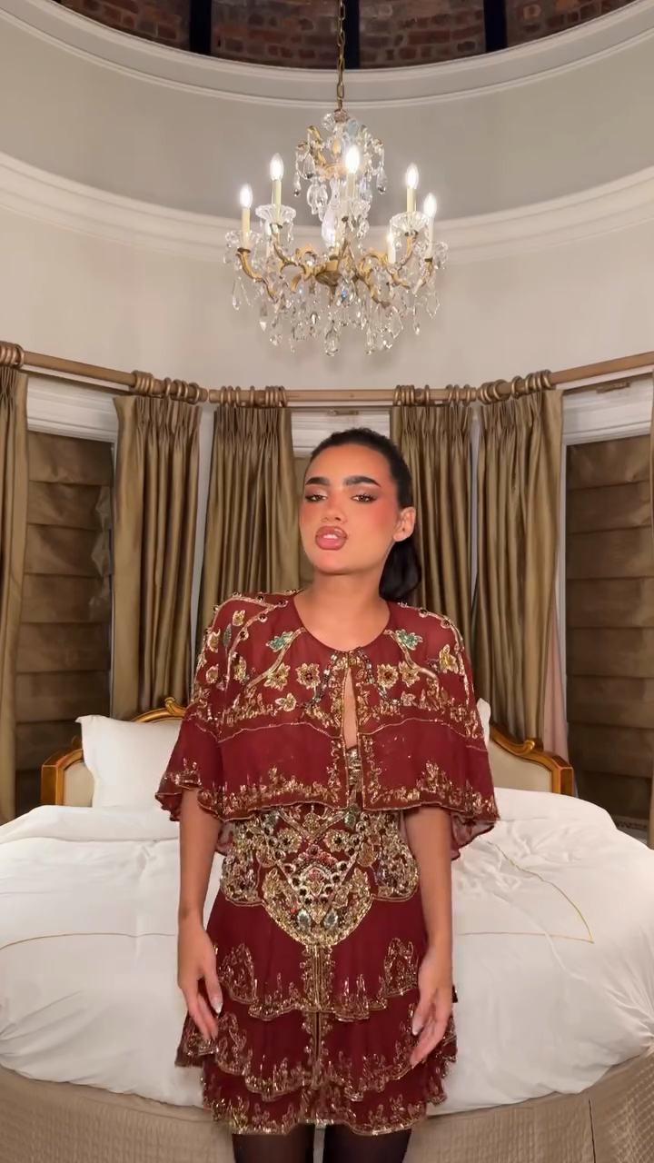 This luxurious burgundy dress features a cape for an added touch of elegance and uniqueness. Embellished with delicate gold embroidery, it exudes a luxurious and romantic feel. The lightweight chiffon fabric creates a cascading ruffle effect. Perfect for formal occasions like gala dinners, high-end parties, and fashion award ceremonies, this dress exudes sophistication and elegance. Accessories complement the dress, elevating the look and showcasing the wearer's refined taste.