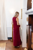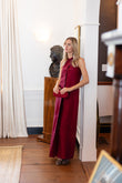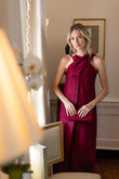 This burgundy maxi dress features a unique halterneck design with crisscross detailing at the neckline, creating a sophisticated and modern look. The flowing silhouette enhances elegance, making it the perfect choice for formal or semi-formal occasions.