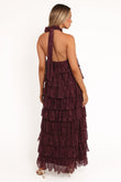 This burgundy maxi dress features an open back that accentuates the shoulders and back. Crafted from delicate lace, the skirt is embellished with cascading ruffles, creating a flowing and romantic silhouette. The high neckline adds a touch of sophistication and elegance.