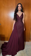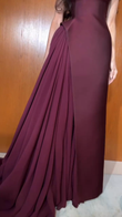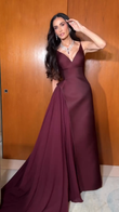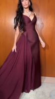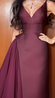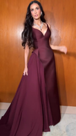 This burgundy gown features a plunging V-neckline and a flattering bodice. The satin fabric lends the gown a luxurious sheen, enhancing its elegance. Side pleats add texture and dimension.