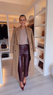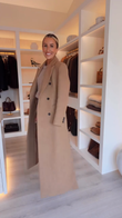 This camel-colored coat features a classic, double-breasted, longline design, exuding elegance and sophistication. Its contoured shoulders and tailored silhouette enhance its sophistication, making it a stylish must-have for colder weather.
