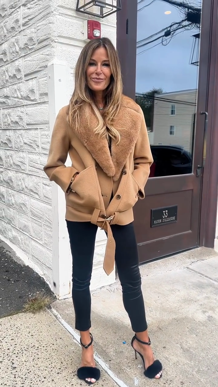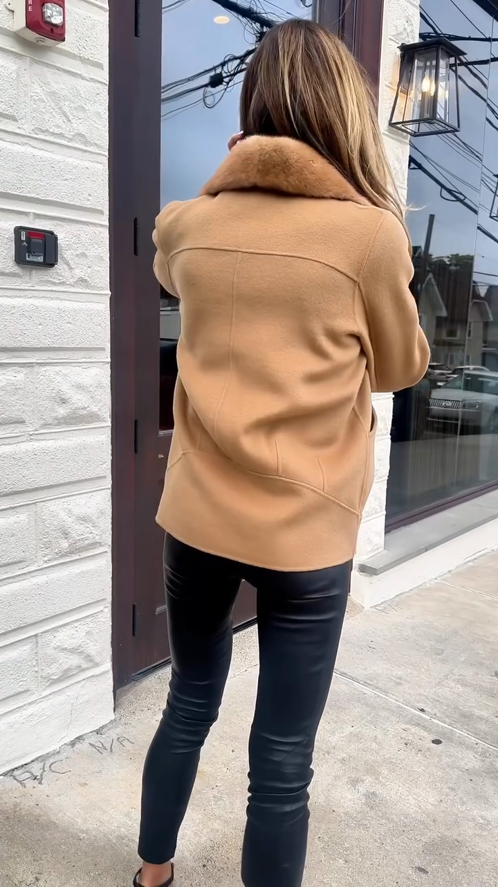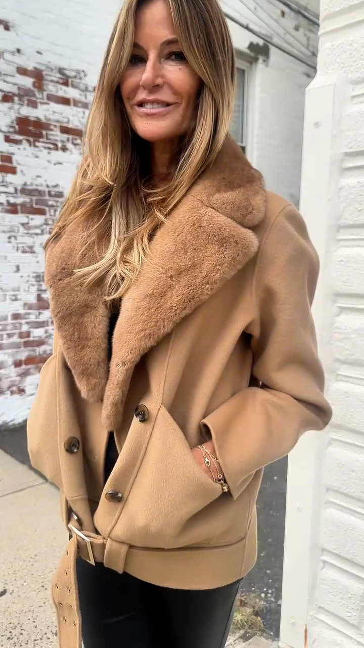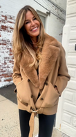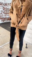 This camel-colored coat features a plush faux-fur collar, adding a touch of luxury and warmth. The coat itself is crafted from soft faux-fur wool, providing exceptional warmth even in cooler weather. The waist tie design allows for an adjustable fit, cinching the waist for a flattering silhouette.