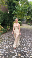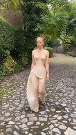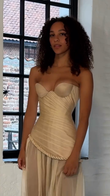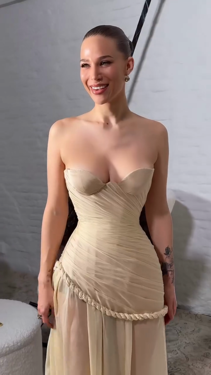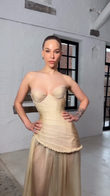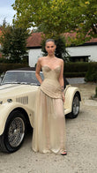 This champagne-colored evening gown features an off-the-shoulder sweetheart neckline that accentuates the graceful curves of the shoulders and collarbone. The delicate draping of the bodice frames the figure and accentuates the wearer's feminine beauty. Rope details at the sides add a unique touch, while the flowing, semi-sheer skirt adds an elegant touch.