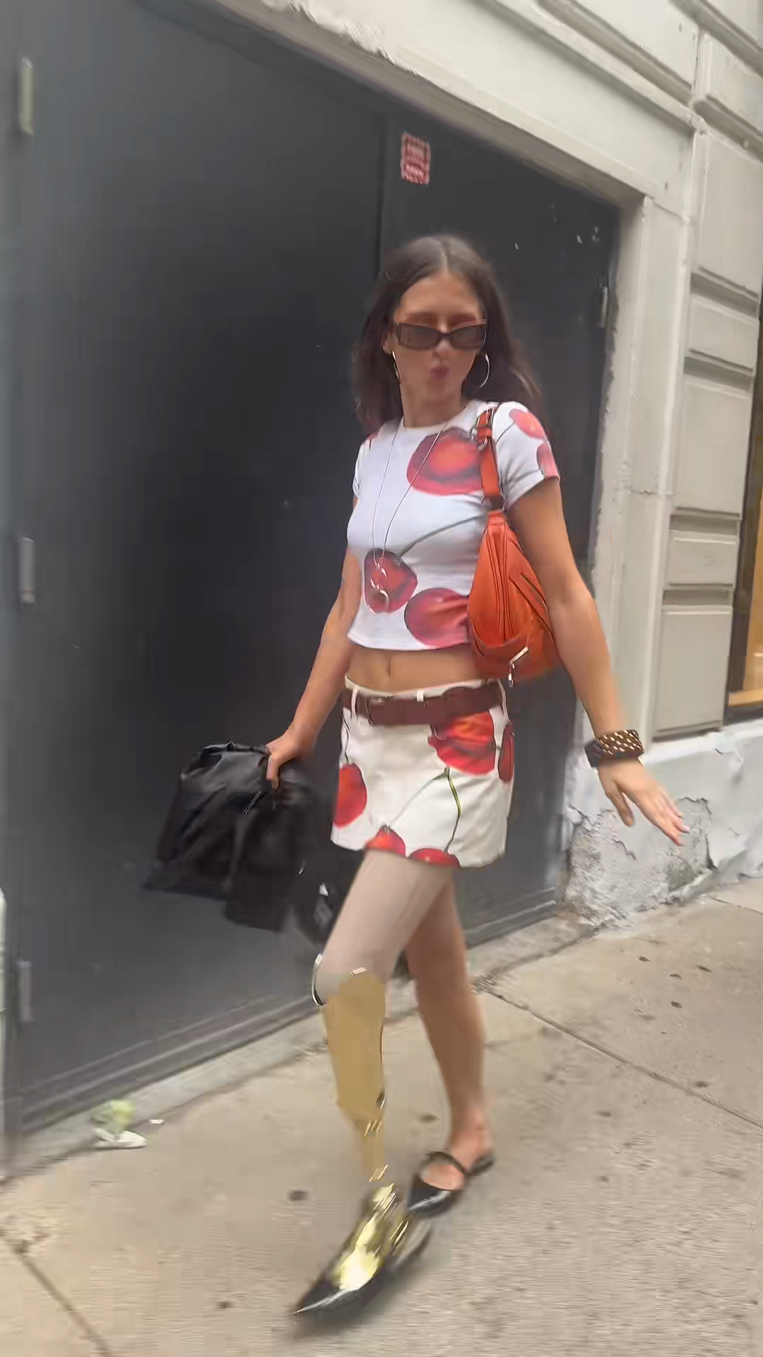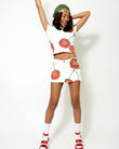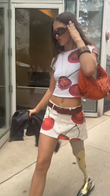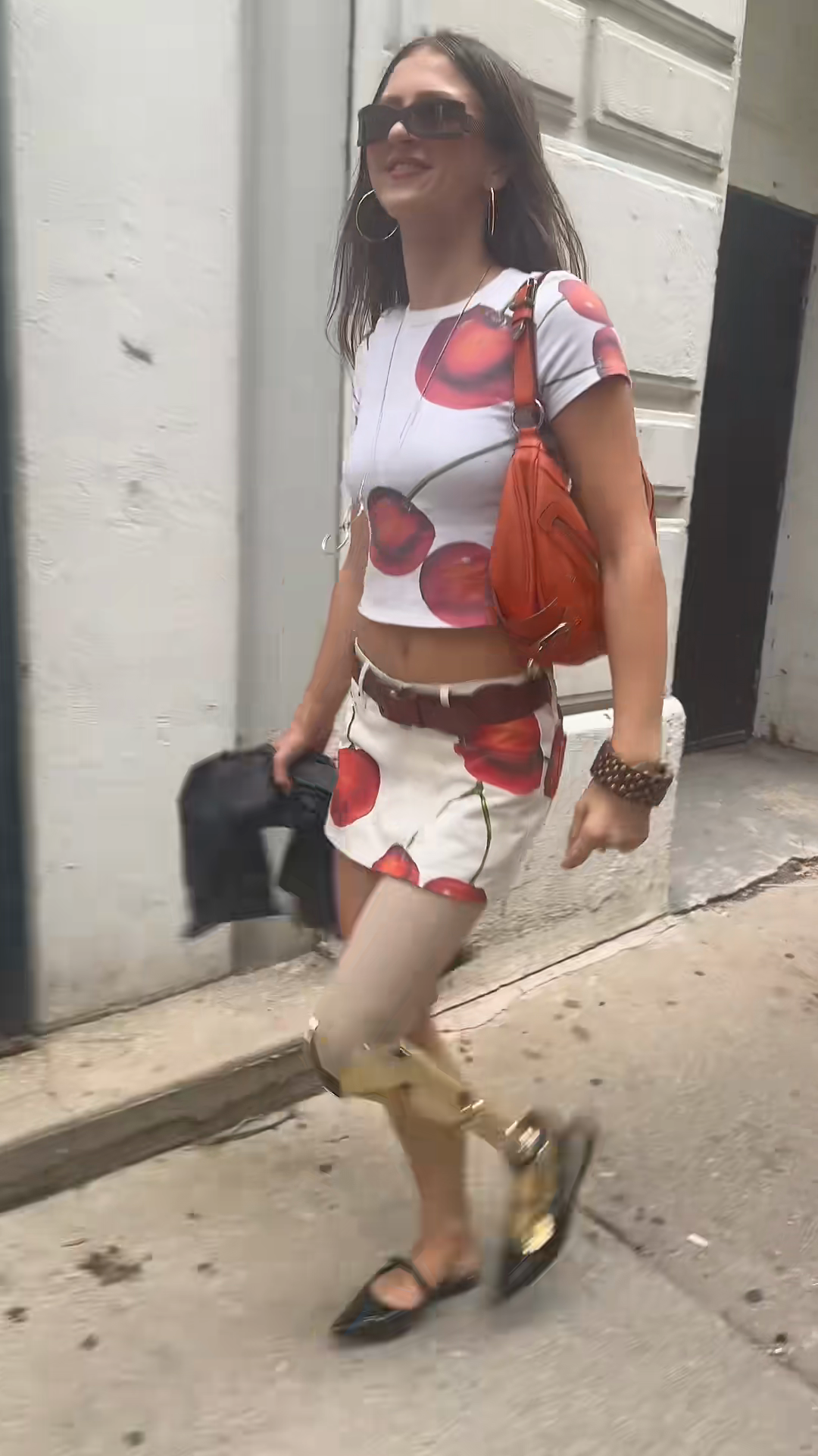 This outfit features a white cropped T - shirt adorned with large cherry prints, paired with a matching white mini skirt that also has cherry prints. The look is accessorized with a green headscarf, white socks, and red Mary - Jane style shoes with white accents. It creates a playful, retro - inspired, and youthful ensemble, perfect for casual outings, summer festivals, or fun social events.
