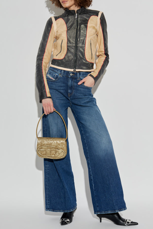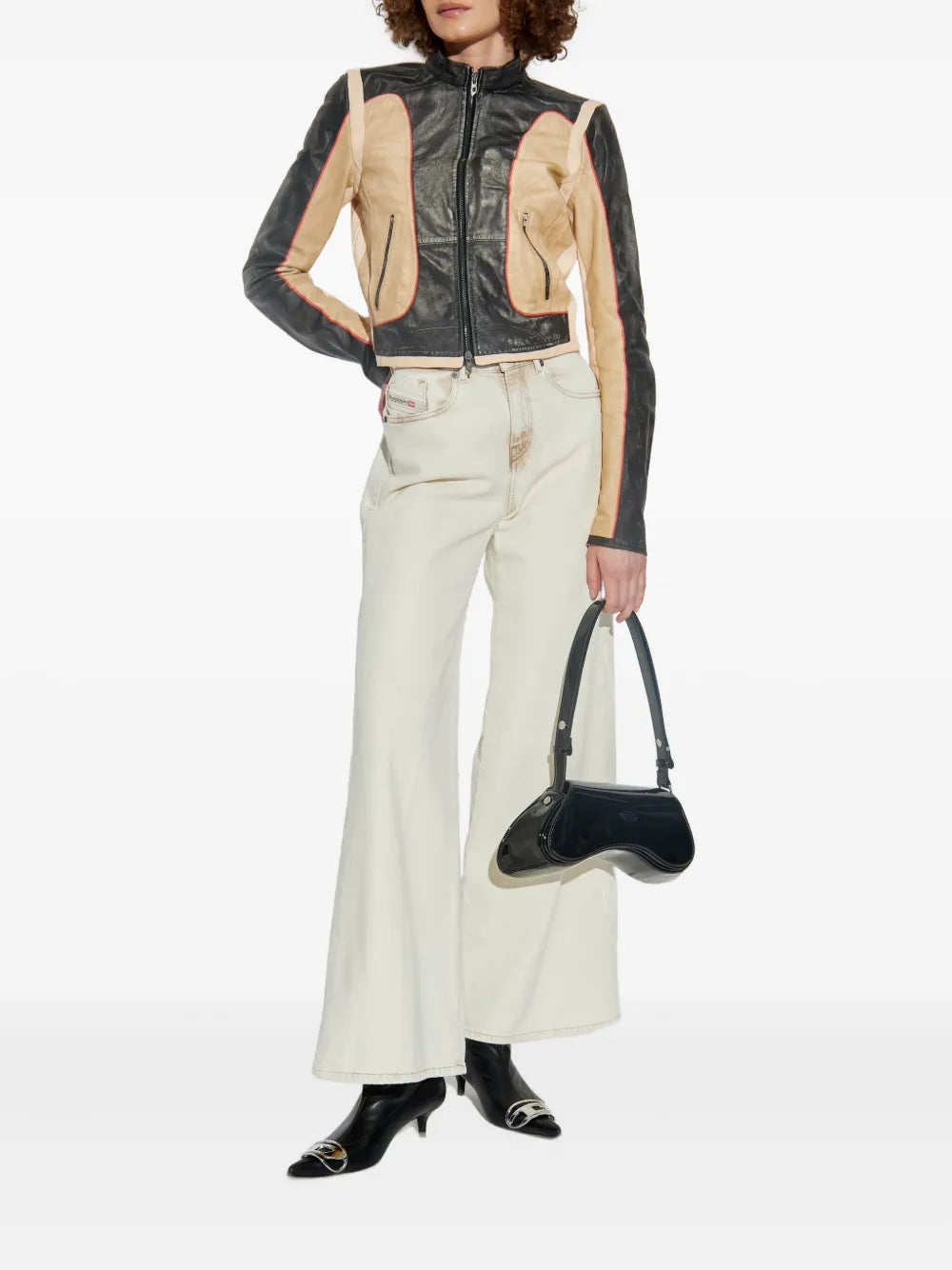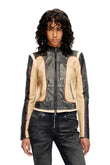 This leather jacket features a striking colorblock pattern, interweaving dark gray and beige with red piping. A zipper front and stand-up collar give this classic moto jacket a modern twist.