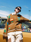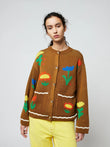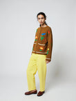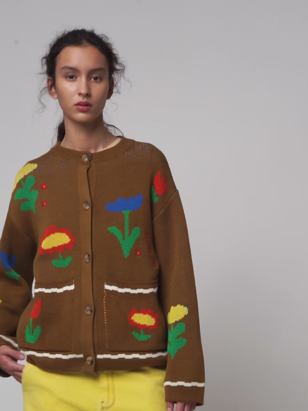 This brown cardigan features a classic crew neckline and a button-down front. The sweater's highlight is its vibrant floral embroidery. These vibrant flowers, in shades of red, yellow, blue, and green, add a playful touch. Two front pockets with white piping create a practical and stylish look. Paired with bright yellow pants, this cardigan creates a cheerful, eye-catching look, perfect for casual outings or adding a pop of color to a simple outfit.