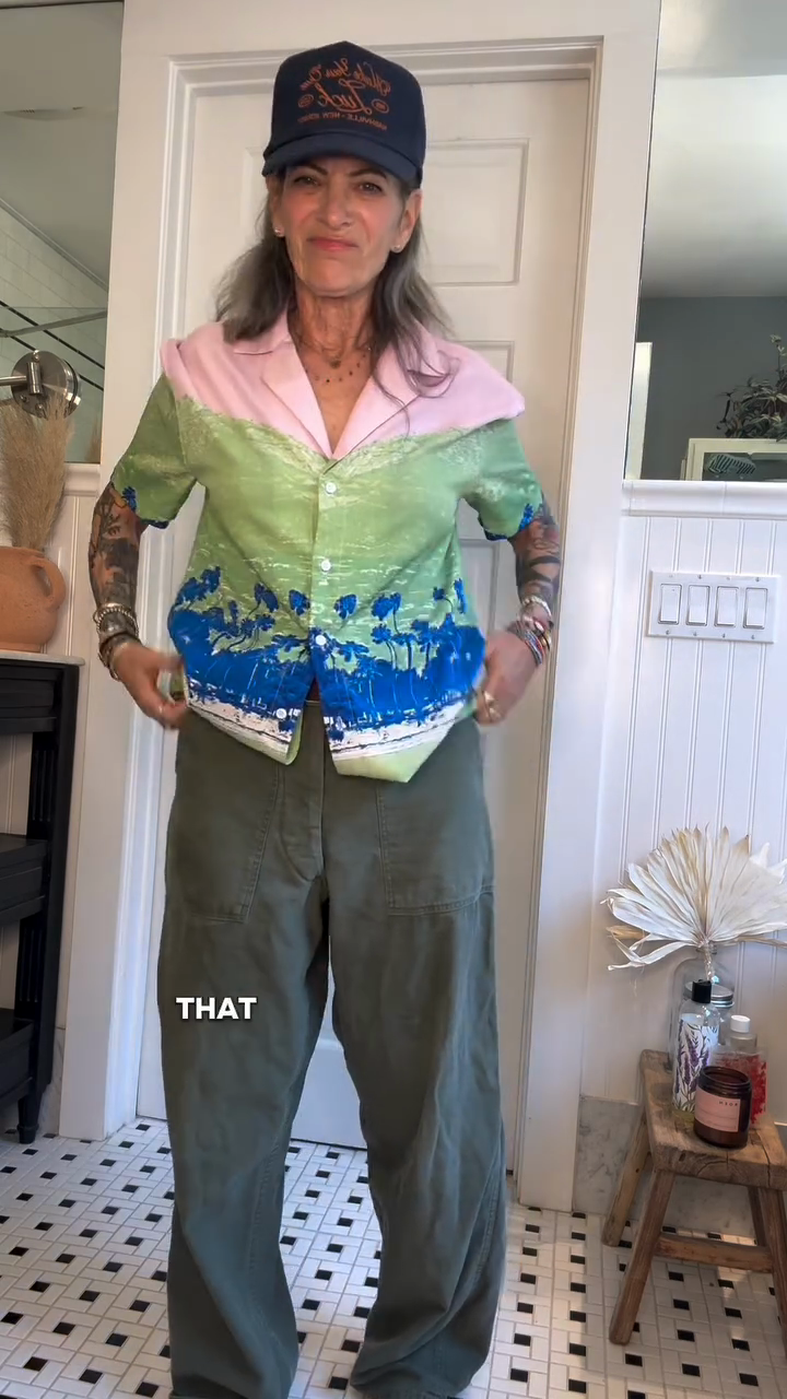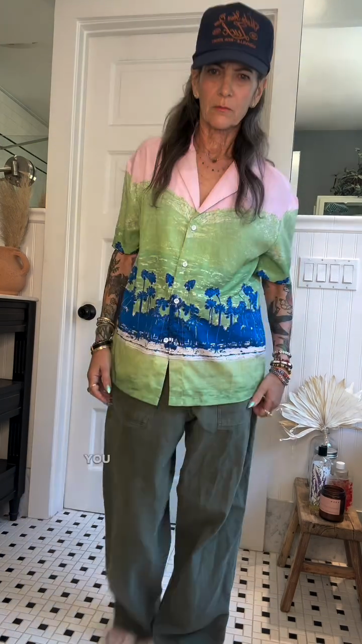 This outfit features a short - sleeved button - up shirt with a vibrant graphic print that includes shades of pink, green, and blue, depicting palm trees and a beach scene. The person is also wearing a dark baseball cap, and accessorized with multiple bracelets on both arms. This look is suitable for a relaxed, casual day out, perhaps running errands or meeting friends in a casual setting.