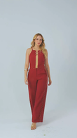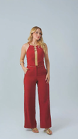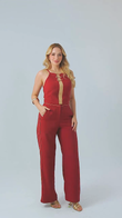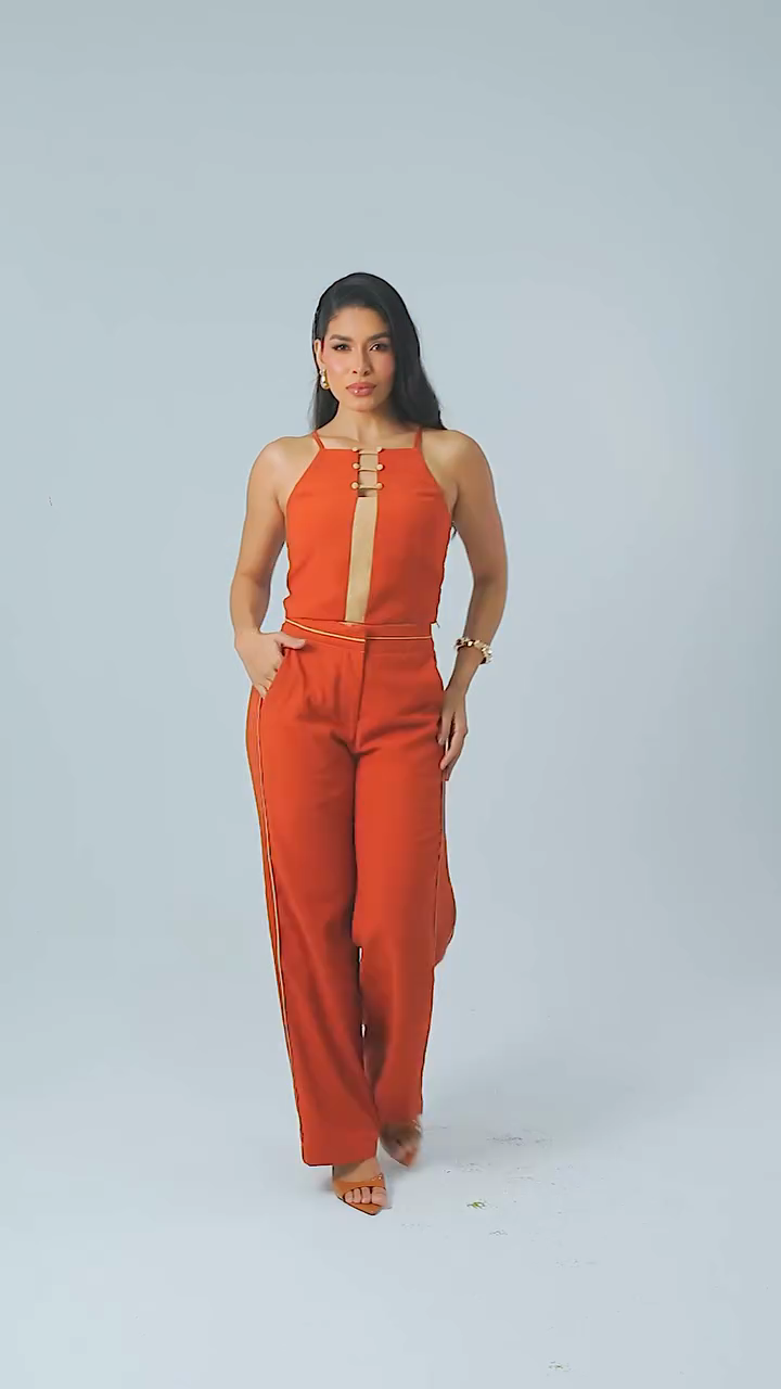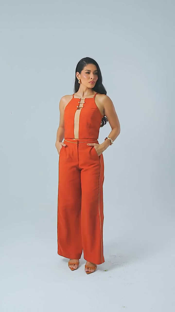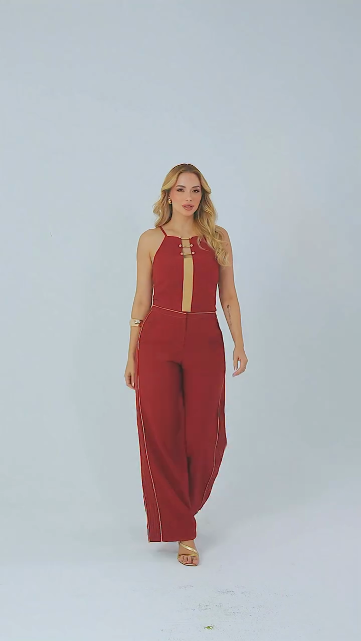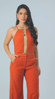 This outfit, crafted from a beige woven fabric, features a button-detailed vest and wide-leg pants. Elevate your smart casual look with metallic heels and minimal jewelry.