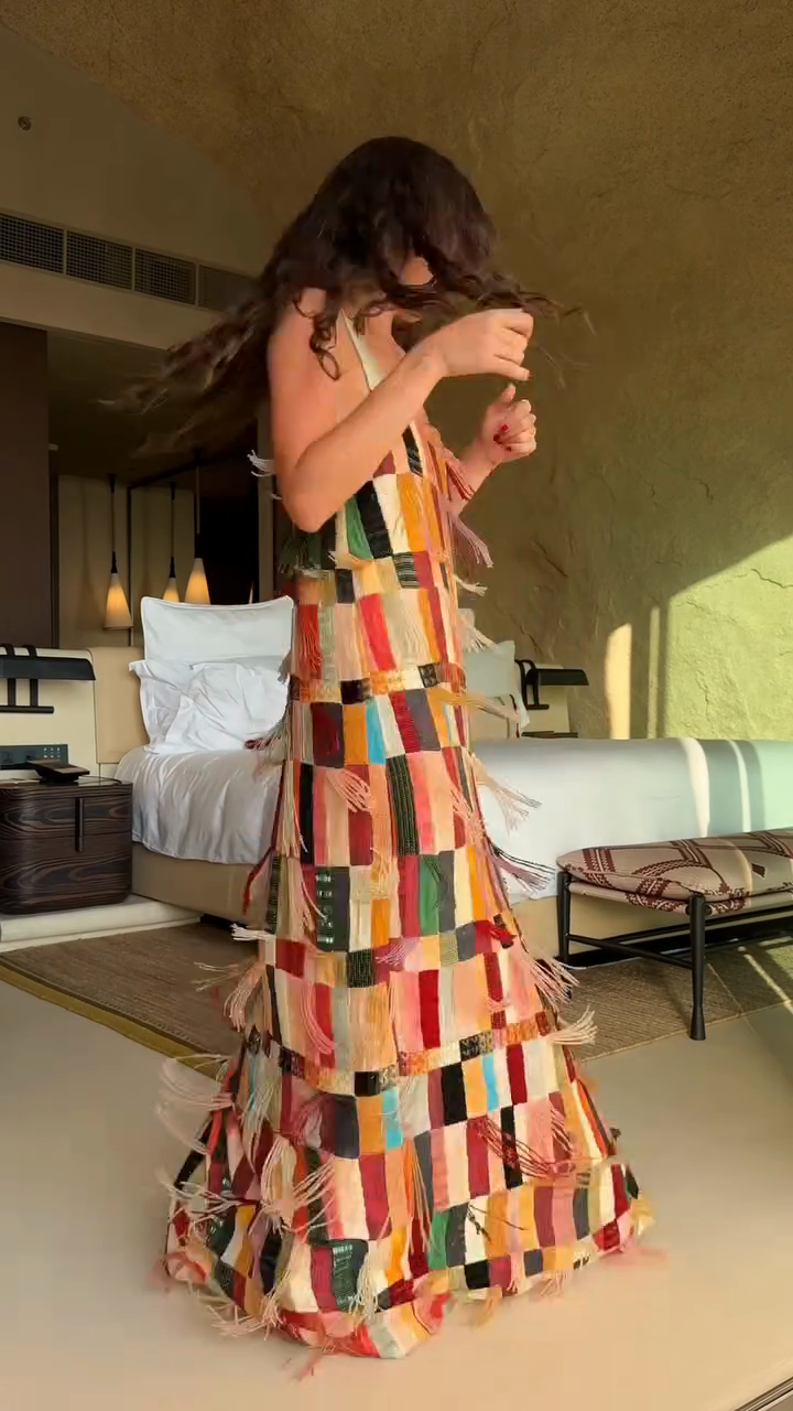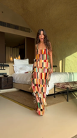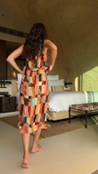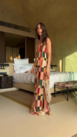 This maxi dress features a vibrant patchwork design embellished with vibrant color blocks for a lively and eye-catching look. The spaghetti straps and square neckline add a touch of simple femininity, while the fringe detailing at the hem adds a touch of bohemian charm.