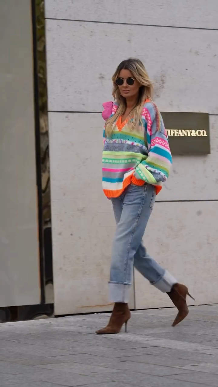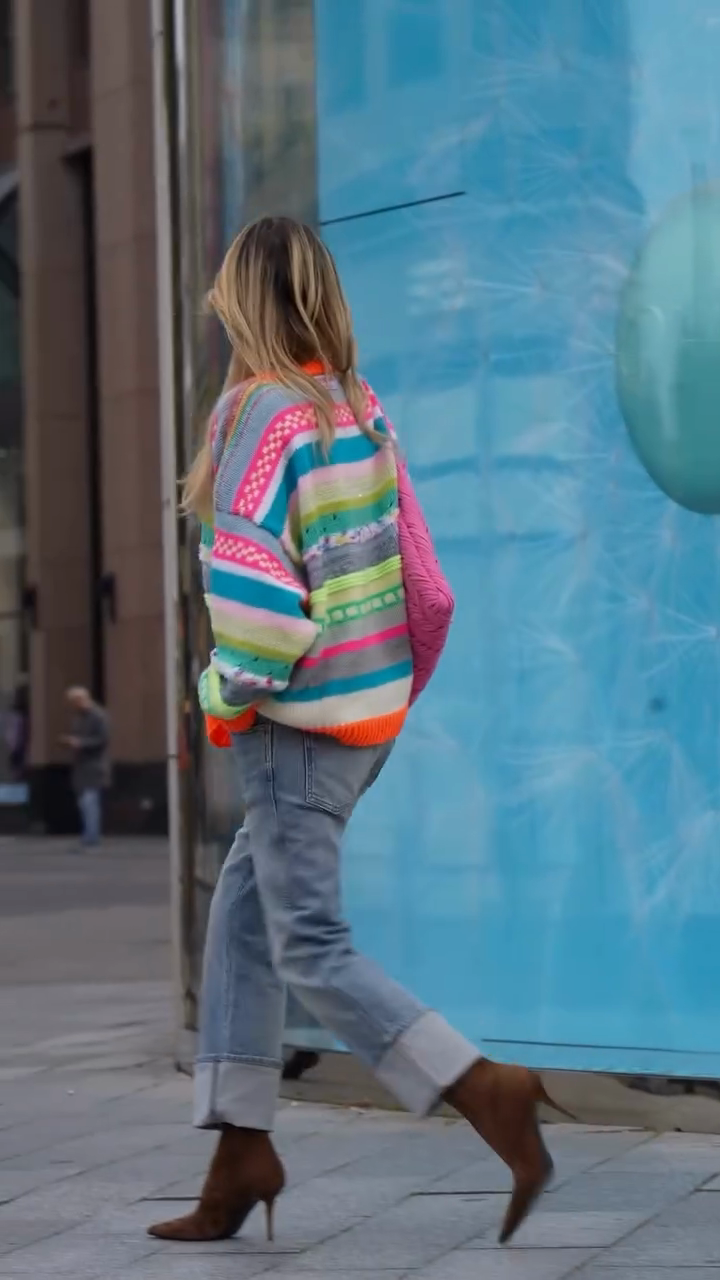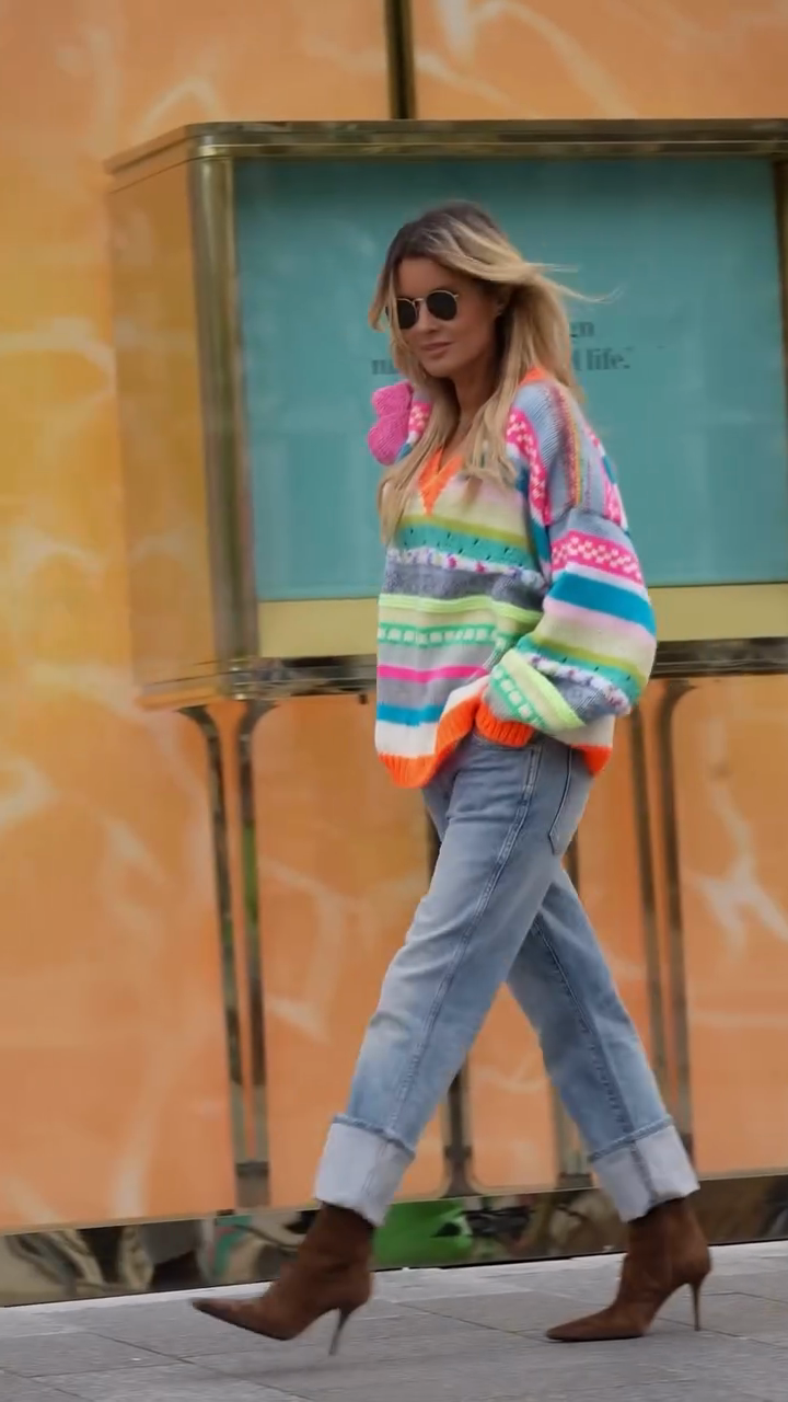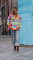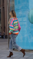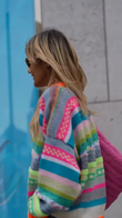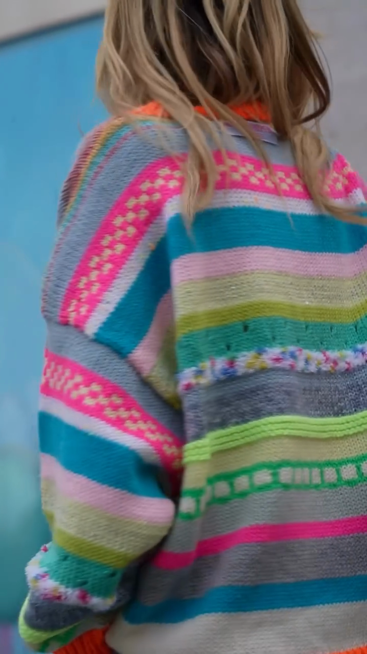 This sweater features a vibrant striped pattern in bright pink, blue, green, and orange. The rich stripes and intricate knit details create a charming and playful look.