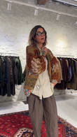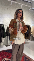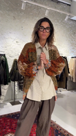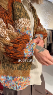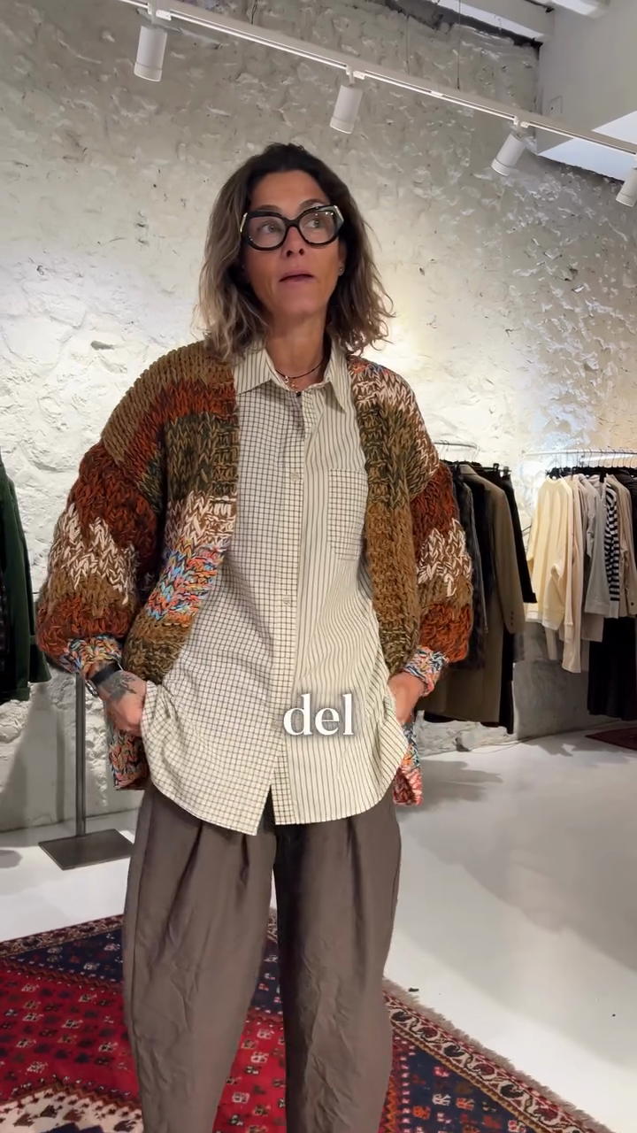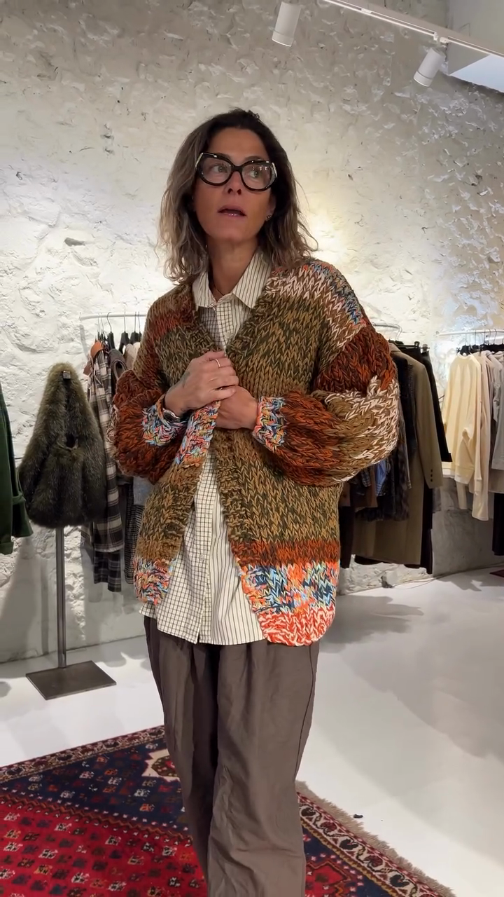 This cardigan blends rich earth tones like brown, green, and orange, accented with vibrant patterns. The textured knit adds tactile and visual interest, making it a striking piece. The loose fit enhances its casual feel.