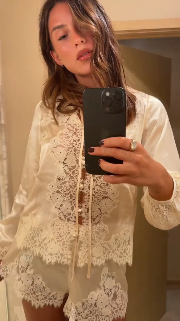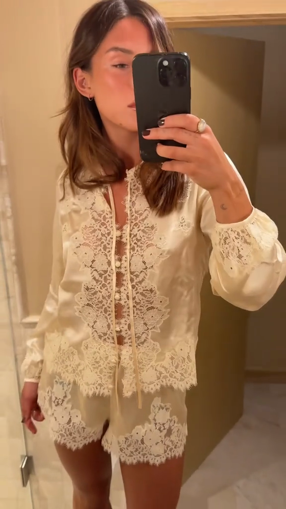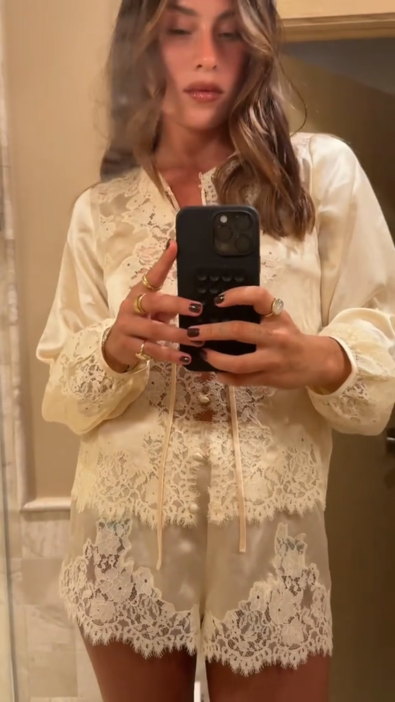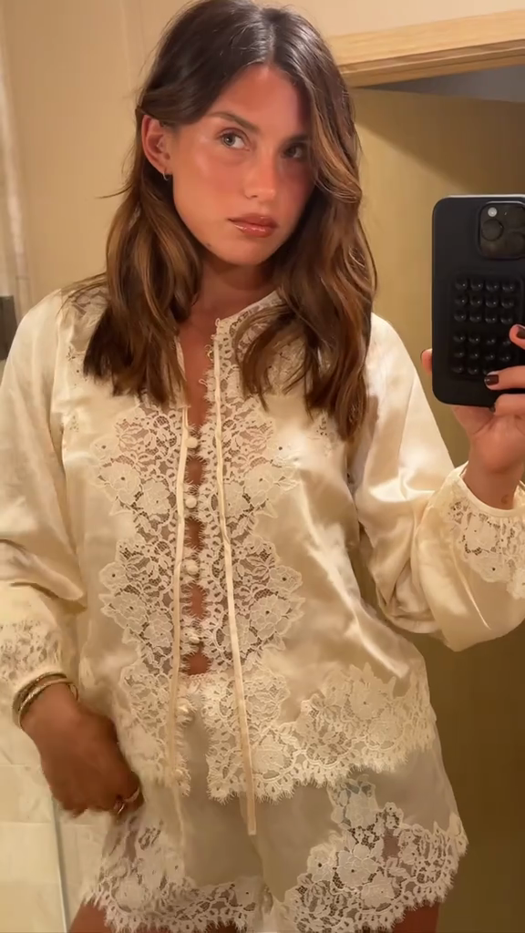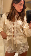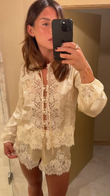 This cream-colored set features delicate lace details. The long-sleeved top fastens with buttons at the front, and the lace panels add a feminine touch, creating a delicate sheer effect. The matching shorts are also trimmed with lace, completing the coordinated, stylish look.
