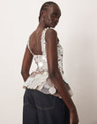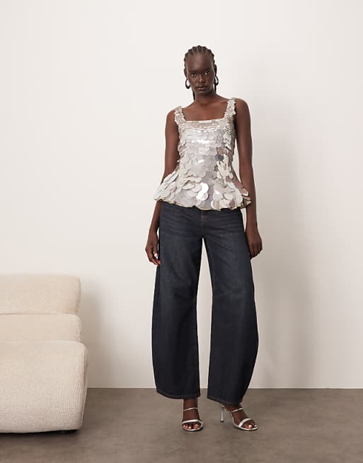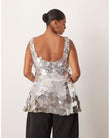 This silver sequined vest is made of silver sequined fabric and adorned with layered disc sequins. It features a square neckline and a fitted cut. Pair it with dark jeans and striking earrings to elevate the overall look.