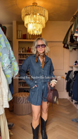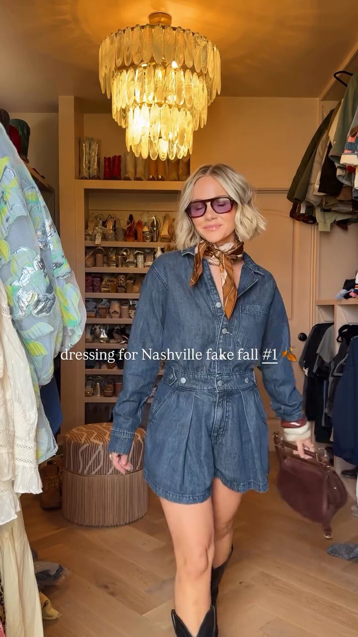 This blue denim jumpsuit features a button-front closure and a nipped waist for a casual yet sophisticated look. A patterned scarf tied around the neck adds a touch of sophistication. Black cowboy boots add a touch of Western flair, perfectly blending in with the Nashville vibe. A brown leather bag with gold accents perfectly blends practicality and style. The overall look is comfortable and stylish, perfect for Nashville's unpredictable weather.