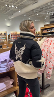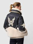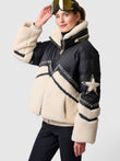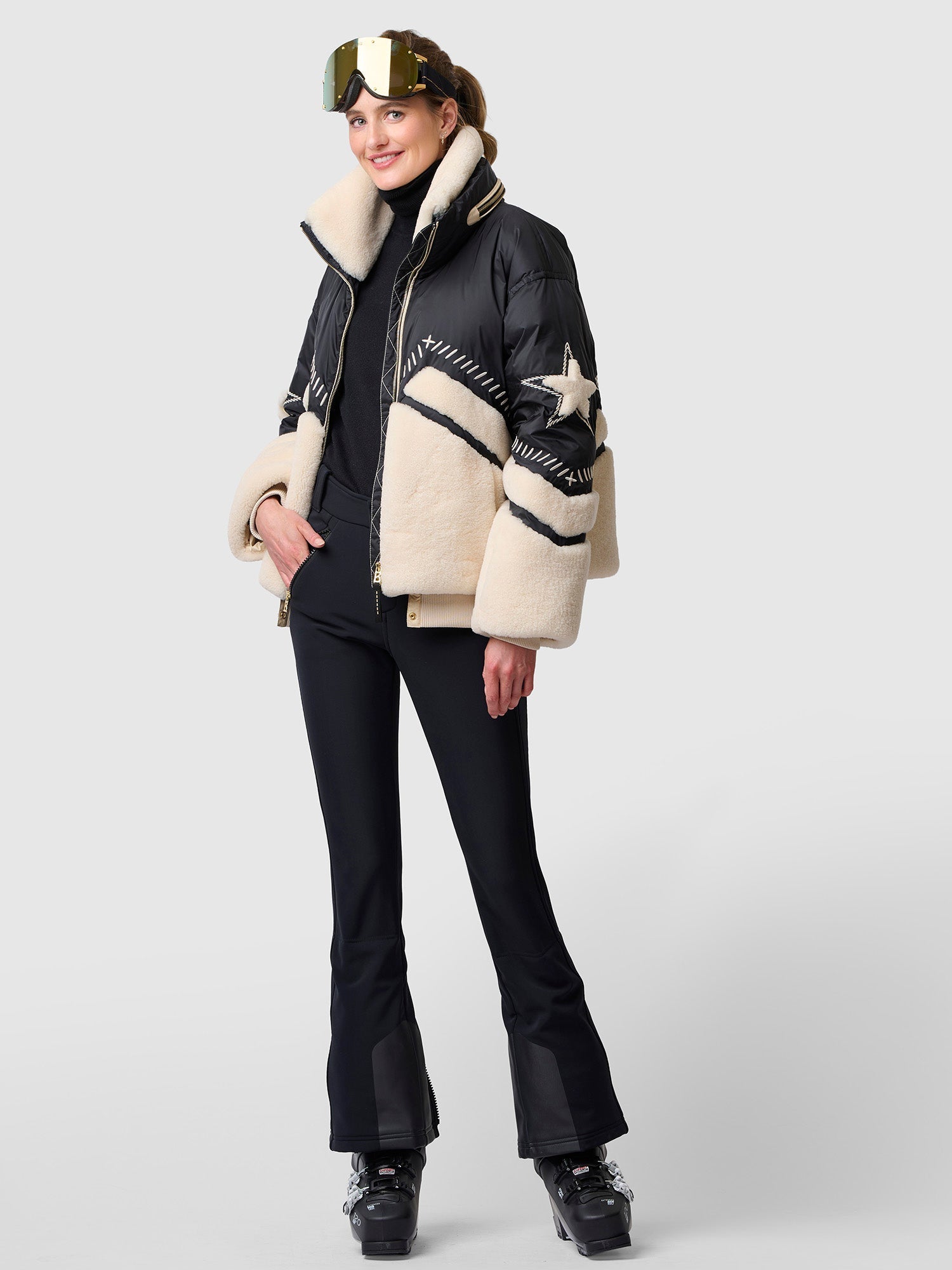 This jacket is crafted from a black nylon and beige wool blend, featuring star embroidery, delicate topstitching details, and a high-necked wool-lined collar. Combining style and functionality, it's ideal for ski trips and winter sports, perfectly blending fashion and practicality. Pair it with ski goggles and black ski pants for a complete look.