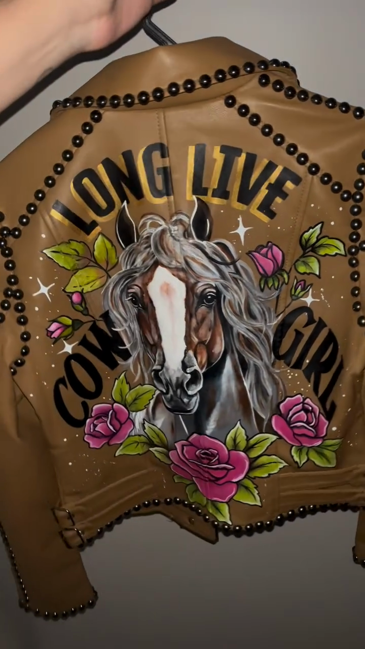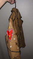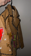 This is a brown leather jacket adorned with numerous black beads along the seams and edges. It features floral embroidery with pink roses and green leaves on the front. Additionally, there are other decorative elements like a horseshoe - shaped embellishment and some text or symbols. A hand is holding the jacket up by a black hanger, and a white price tag is attached to it. The jacket has a unique, eye - catching design, suitable for making a fashion statement at events or casual outings where standing out is desired.