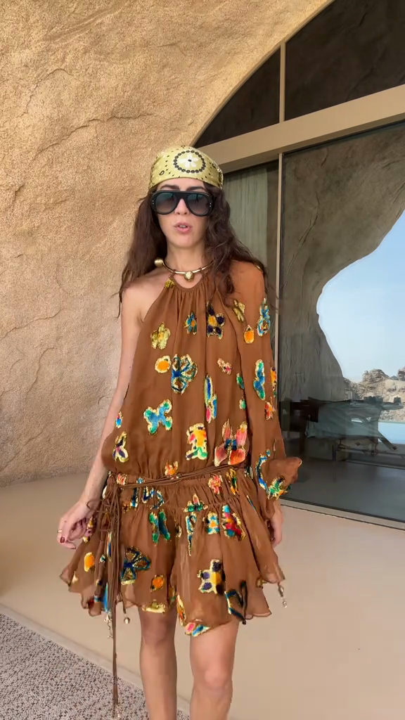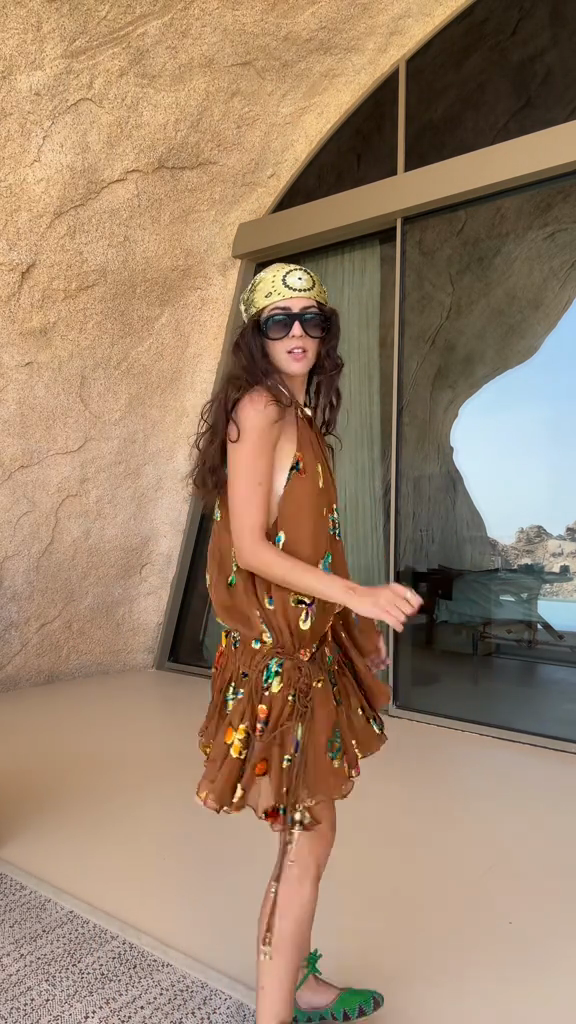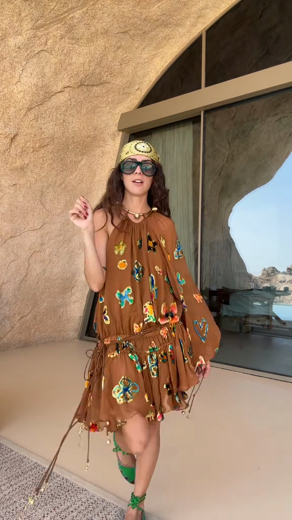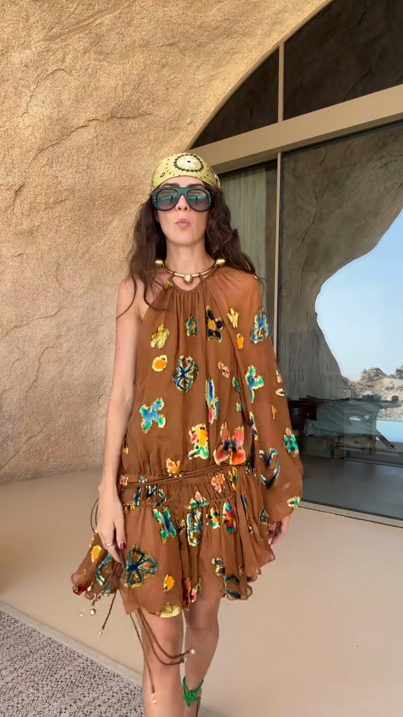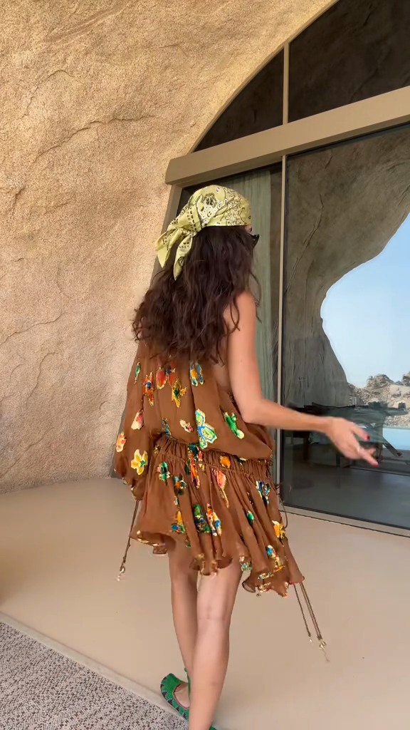 Perfect for casual outdoor activities, beach parties, or vacation getaways. A gold headband, a large gold necklace, and green sequined shoes add a bold, fashionable touch. Sunglasses add a touch of glamour, making it the perfect choice for sunny days.