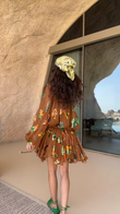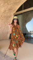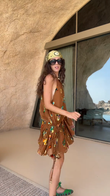 This brown mini dress features an asymmetrical silhouette and an off-the-shoulder detail. It's embellished with a colorful, intricate embroidery pattern, adding a vibrant, artistic touch. The drawstring waistband creates a pleated effect, enhancing the flowing silhouette.